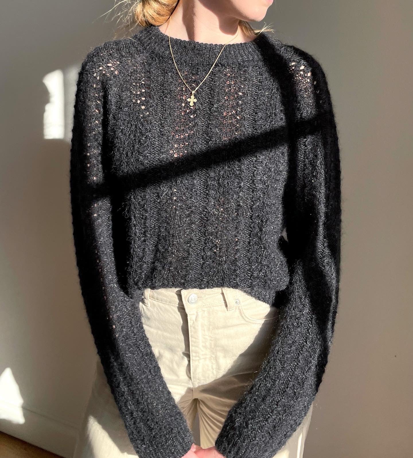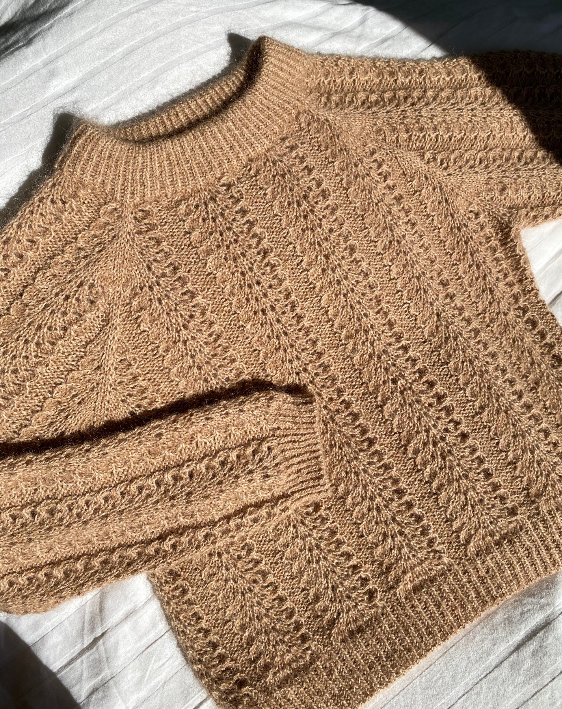 Ærmerne strikkes herefter ved at sætte de hvilende masker tilbage på pinden og samle yderligere masker op i ærmegabet. Ærmerne strikkes ligeledes i hulmønsteret og der laves indtagninger på undersiden af ærmerne. Der afsluttes med drejede ribkanter og italiensk aflukning.