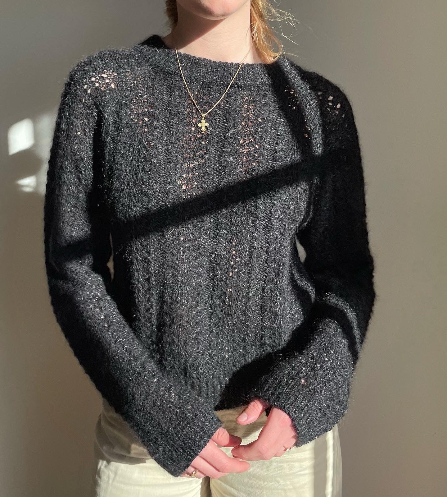 The sweater is worked top down on circular needles. First stitches are cast on and worked in twisted rib to form the edge of the neck. When the rib edge is finished, 8 stitch markers are placed and the yoke of the sweater is worked in a raglan construction, starting with a few short rows. When the yoke is finished, stitches for the sleeves are transferred to a piece of scrap yarn/stitch holder while the rest of the body is worked. Afterwards the sleeves are worked in the same lace pattern as the body. Both the body and the sleeves are finished with twisted rib edges and Italian cast-off.