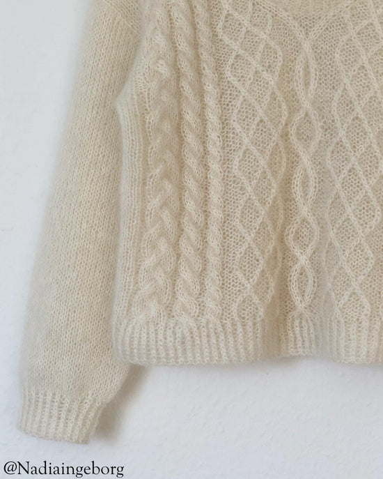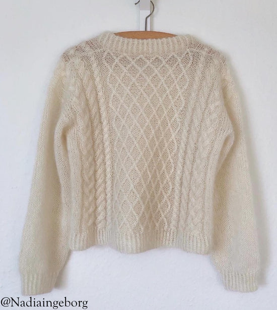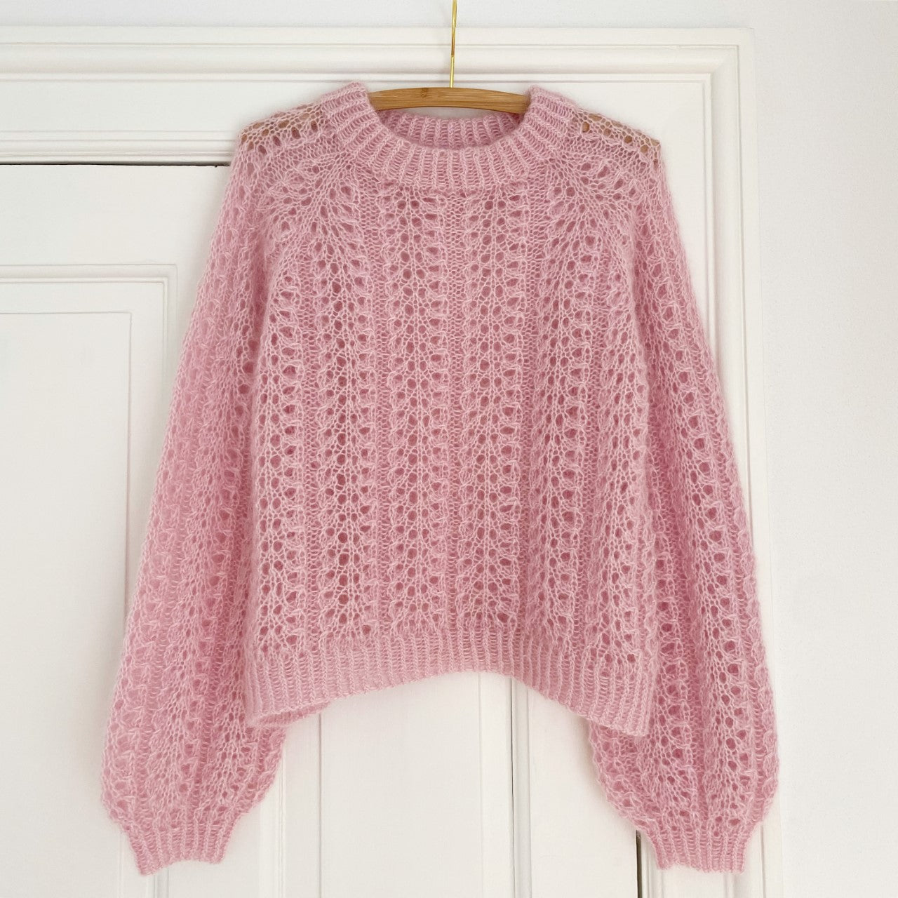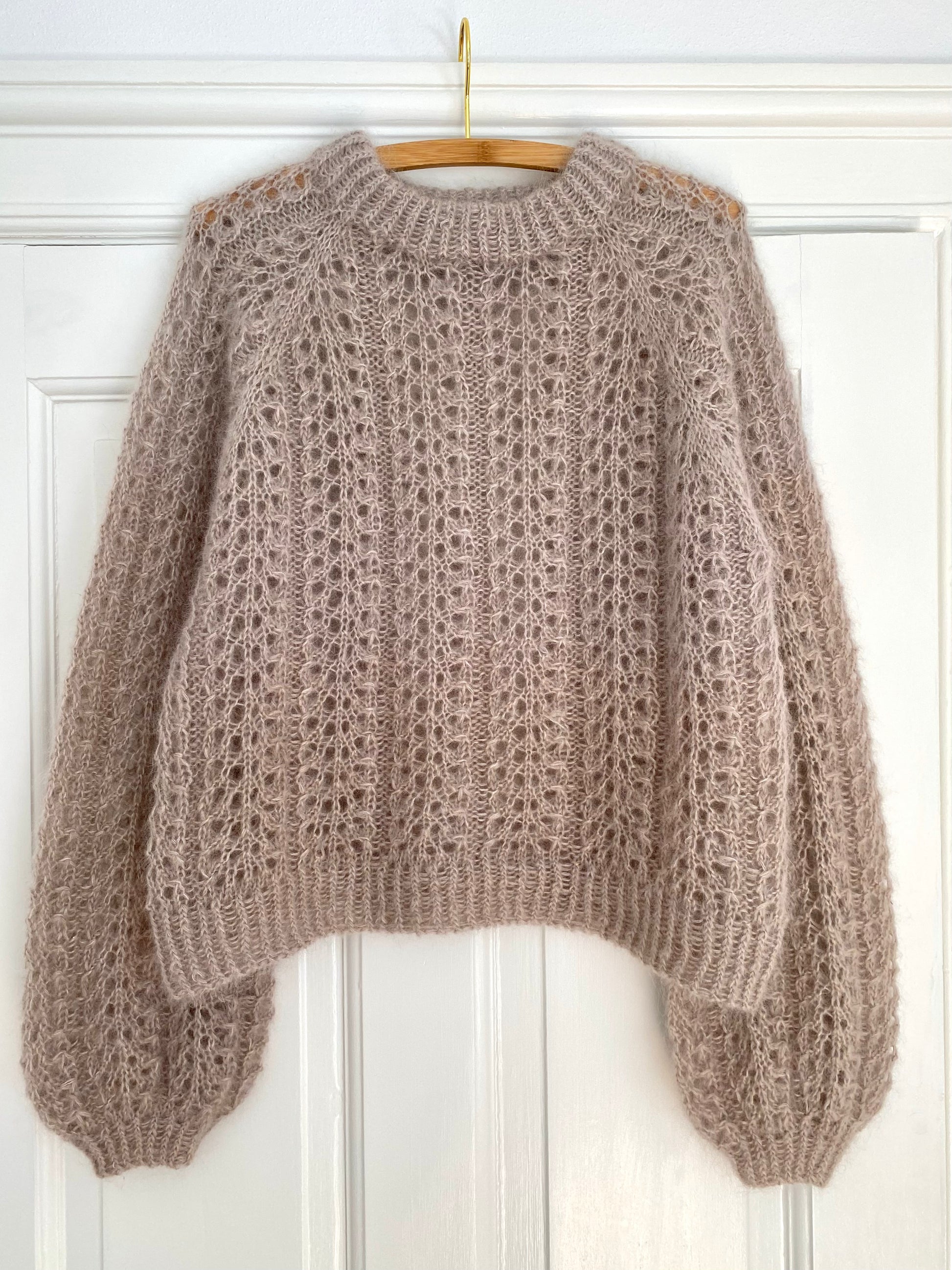 Sweateren strikkes oppefra og ned, på rundpind. Først slås masker op til halskanten, der strikkes i drejet rib. Herefter inddeles maskerne med 8 markører, hvorom der laves raglan-udtagninger. Først laves der vendepinde for at forme rygstykket, herefter strikkes rundt på pinden, i mønster efter rapporten, mens der fortsat laves udtagninger omkring markørerne. Når bærestykket er strikket færdigt, sættes ærmemaskerne til hvile mens forstykket og bagstykket samles til kroppen, der færdiggøres ved at strikke rundt på pinden. Der afsluttes med drejet ribkant og italiensk aflukning. Ærmerne strikkes herefter ved at sætte de hvilende masker tilbage på pinden og samle yderligere masker op i ærmegabet. Ærmerne strikkes lige ned i hulmønsteret, indtil kort før ribkanten, hvor der laves indtagninger for at skabe ballon-effekten.