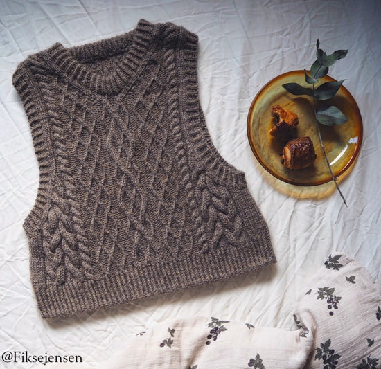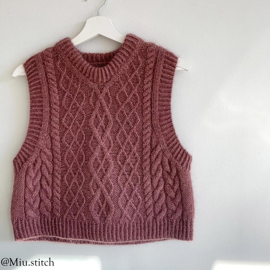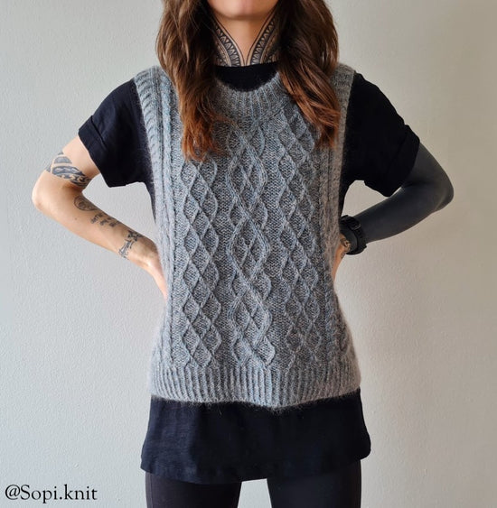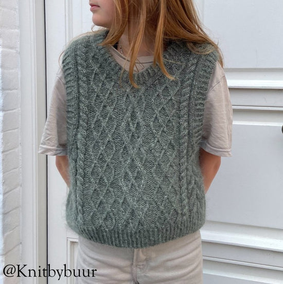 3 tråde: Mayflower Super Kid Silk (25 g = 195 m) eller Lana Gatto Silk Mohair (25 g = 212 m) eller Drops Kid-silk (25 g = 210 m) eller Mayflower Elba (25 g = 250 m).