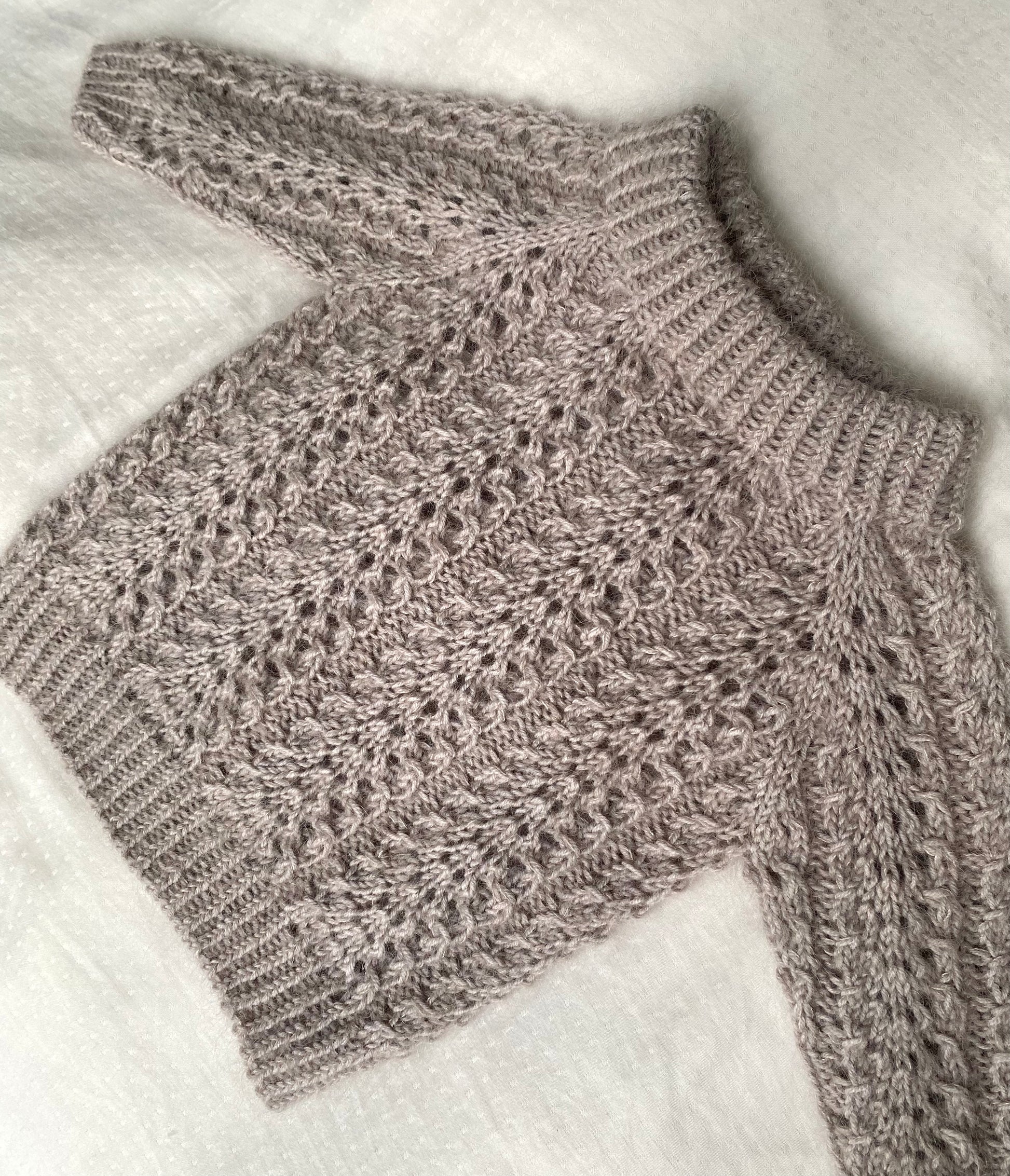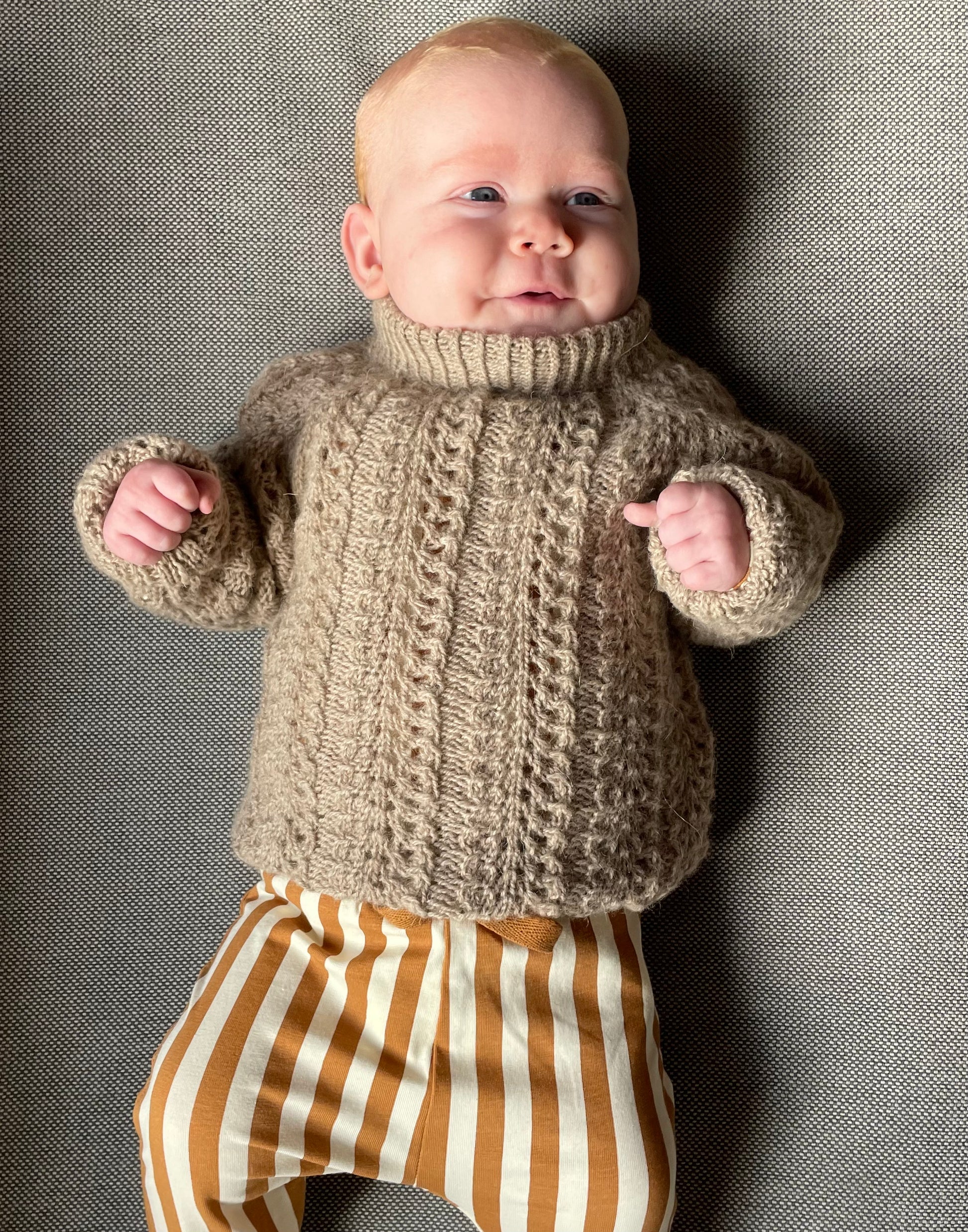 Den lysegrå sweater er strikket i Mayflower London Merino Fine i fv. 004 Sandstrand og Mayflower Super Kid Silk fv. 06 Råhvid.