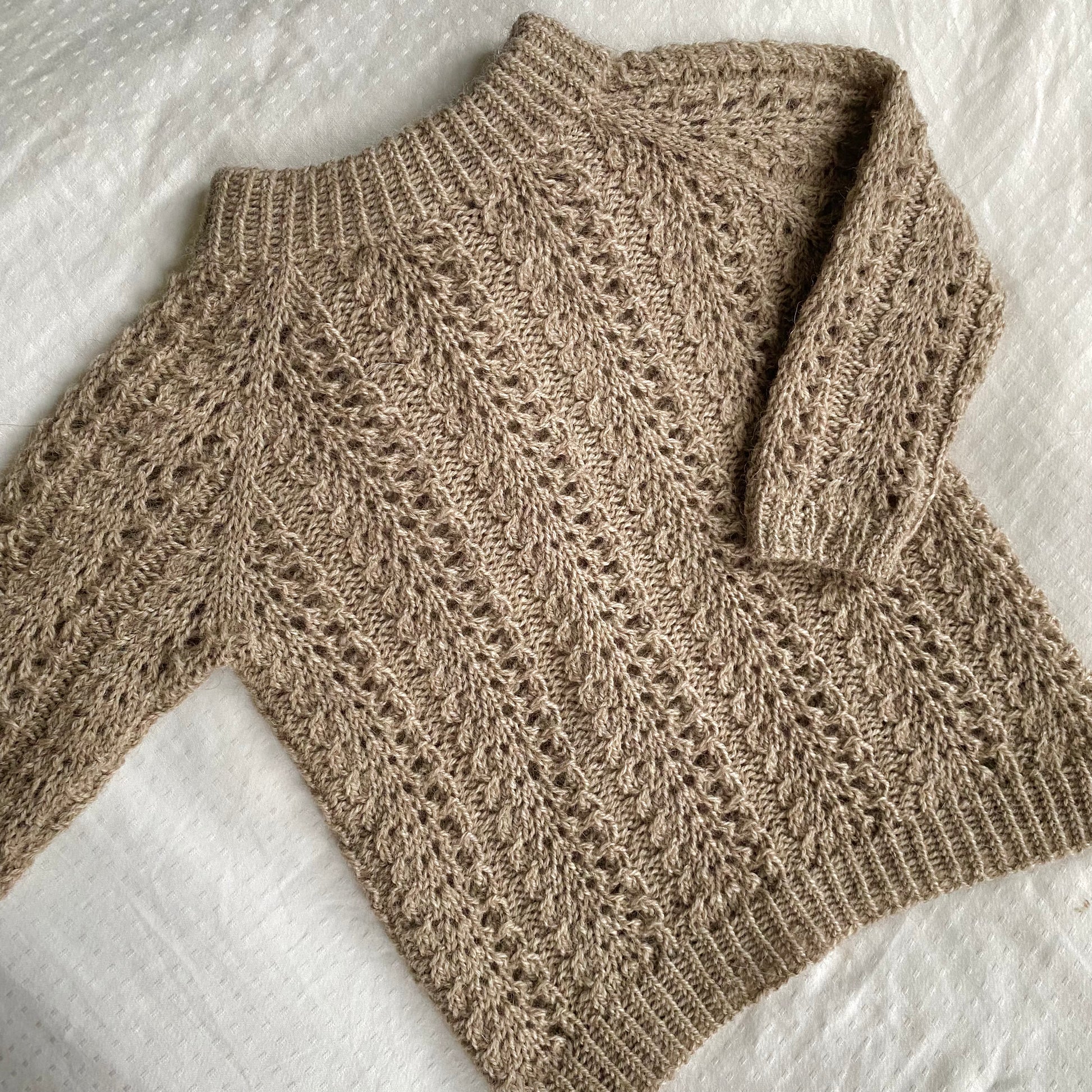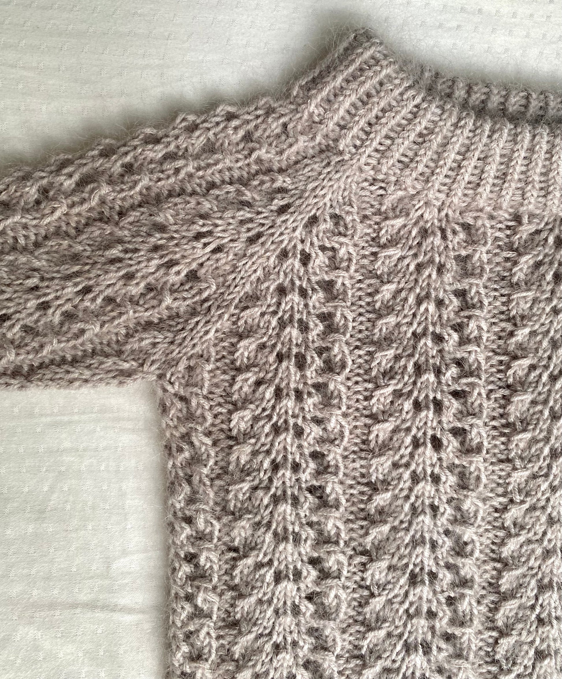 Ermene strikkes deretter ved å sette de hvilende maskene tilbake på pinnen og samle ytterligere masker opp i ermegapet. Ermene strikkes i hullmønsteret, mens det løpende felles og avsluttes med vridde ribbkanter og italiensk avfelling.