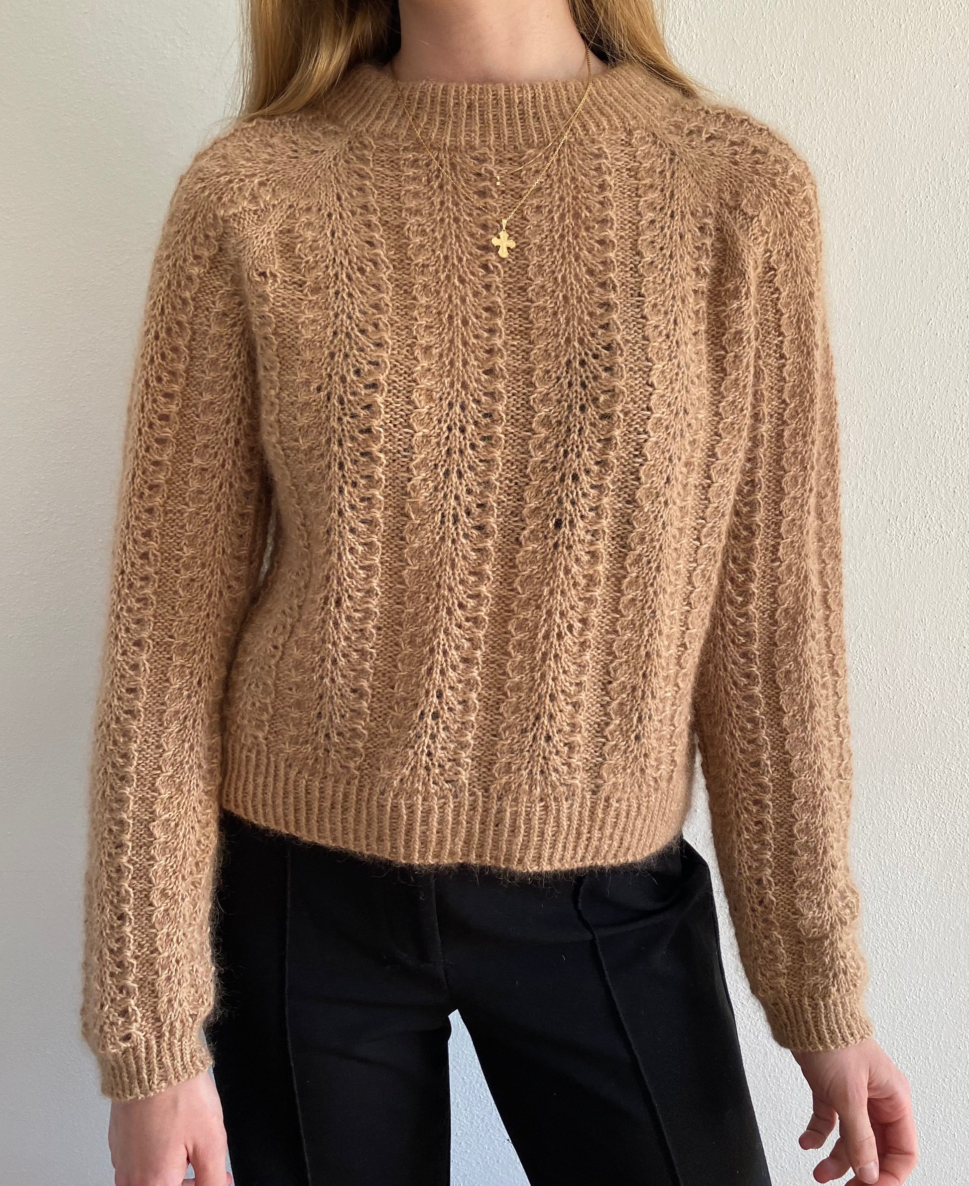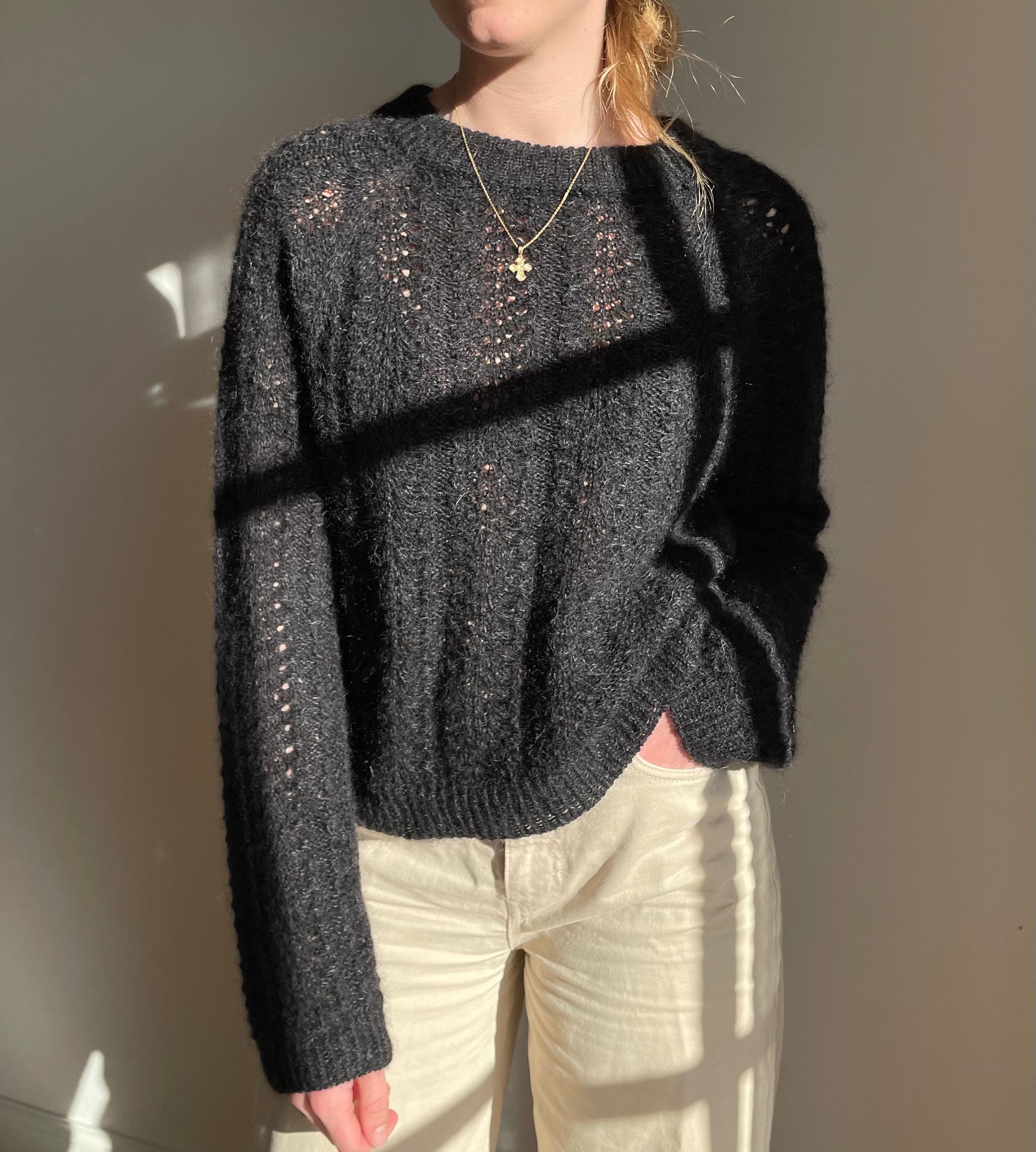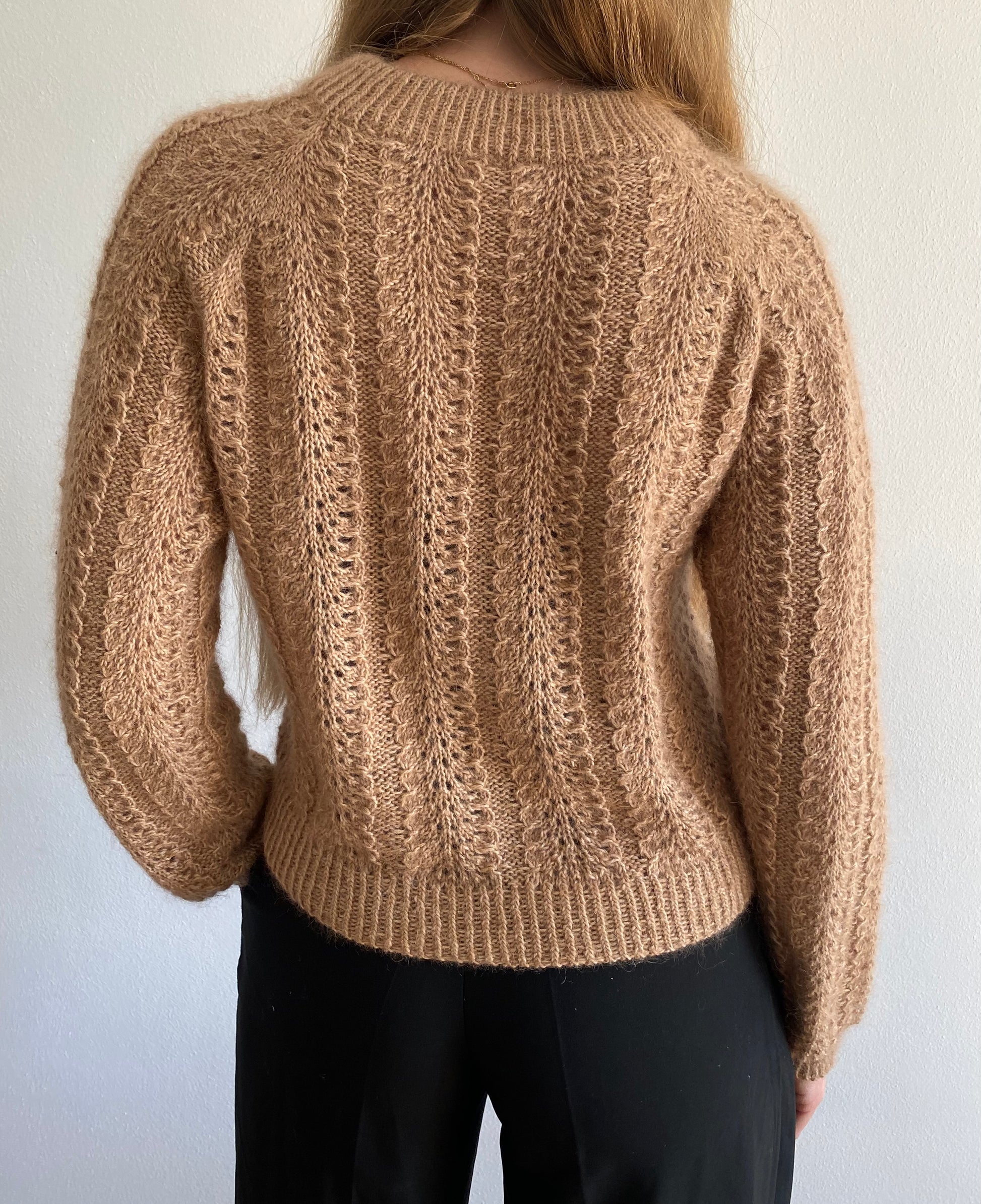 Ermene strikkes deretter ved å sette de hvilende maskene tilbake på pinnen og samle ytterligere masker opp i ermegapet. Ermene strikkes i hullmønsteret, mens det løpende felles og avsluttes med vridde ribbkanter og italiensk avfelling.