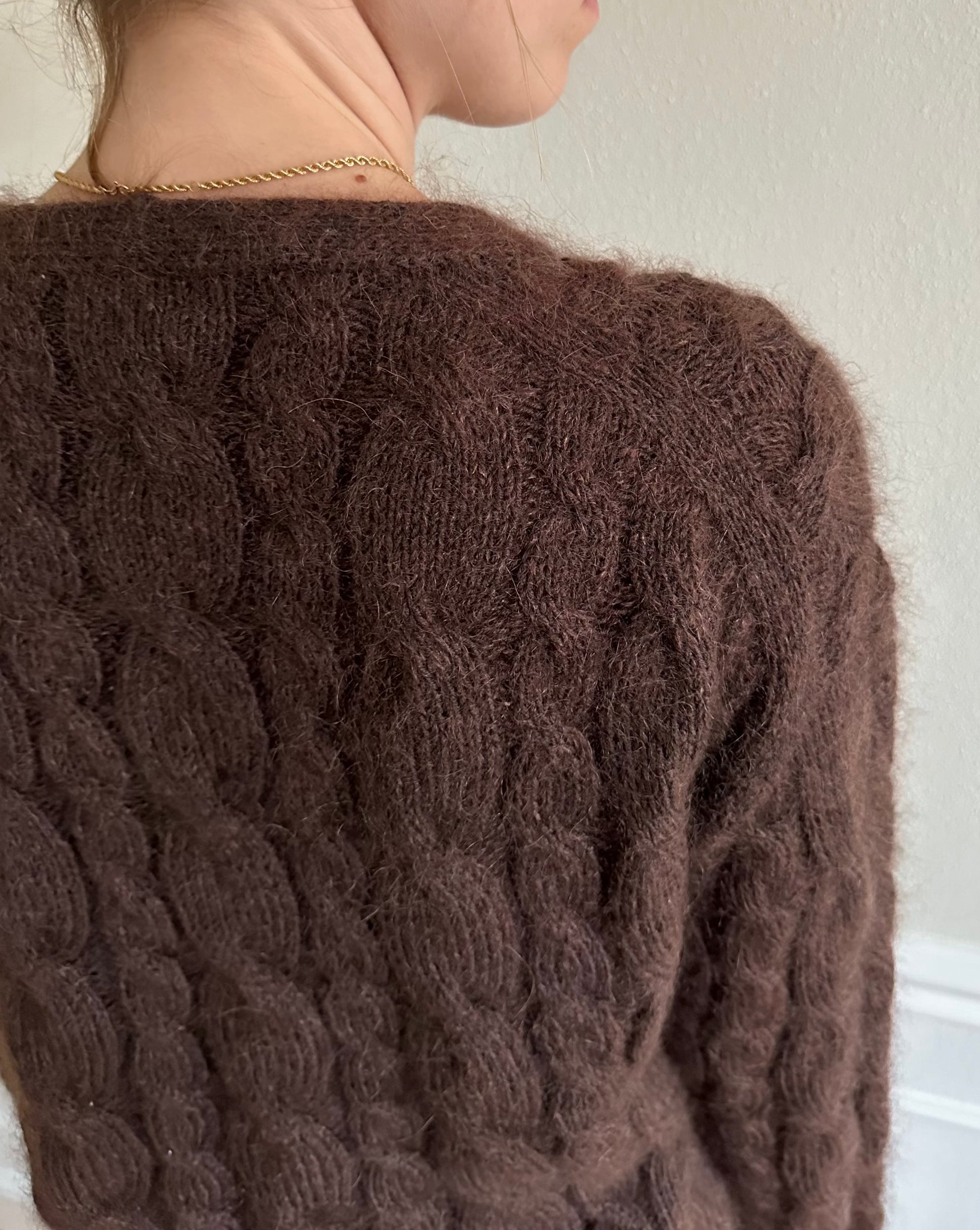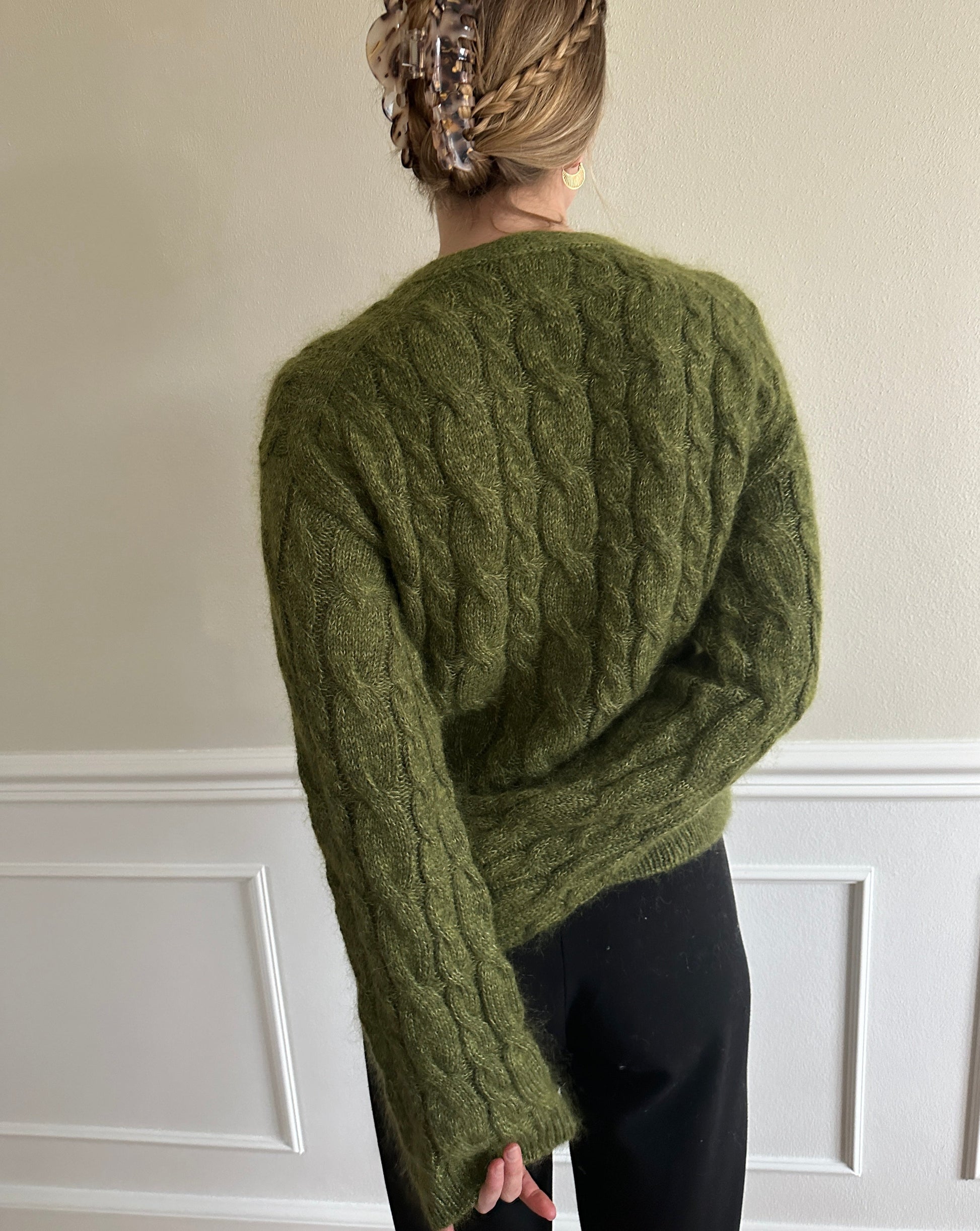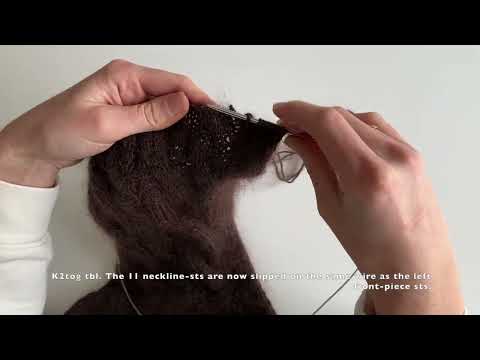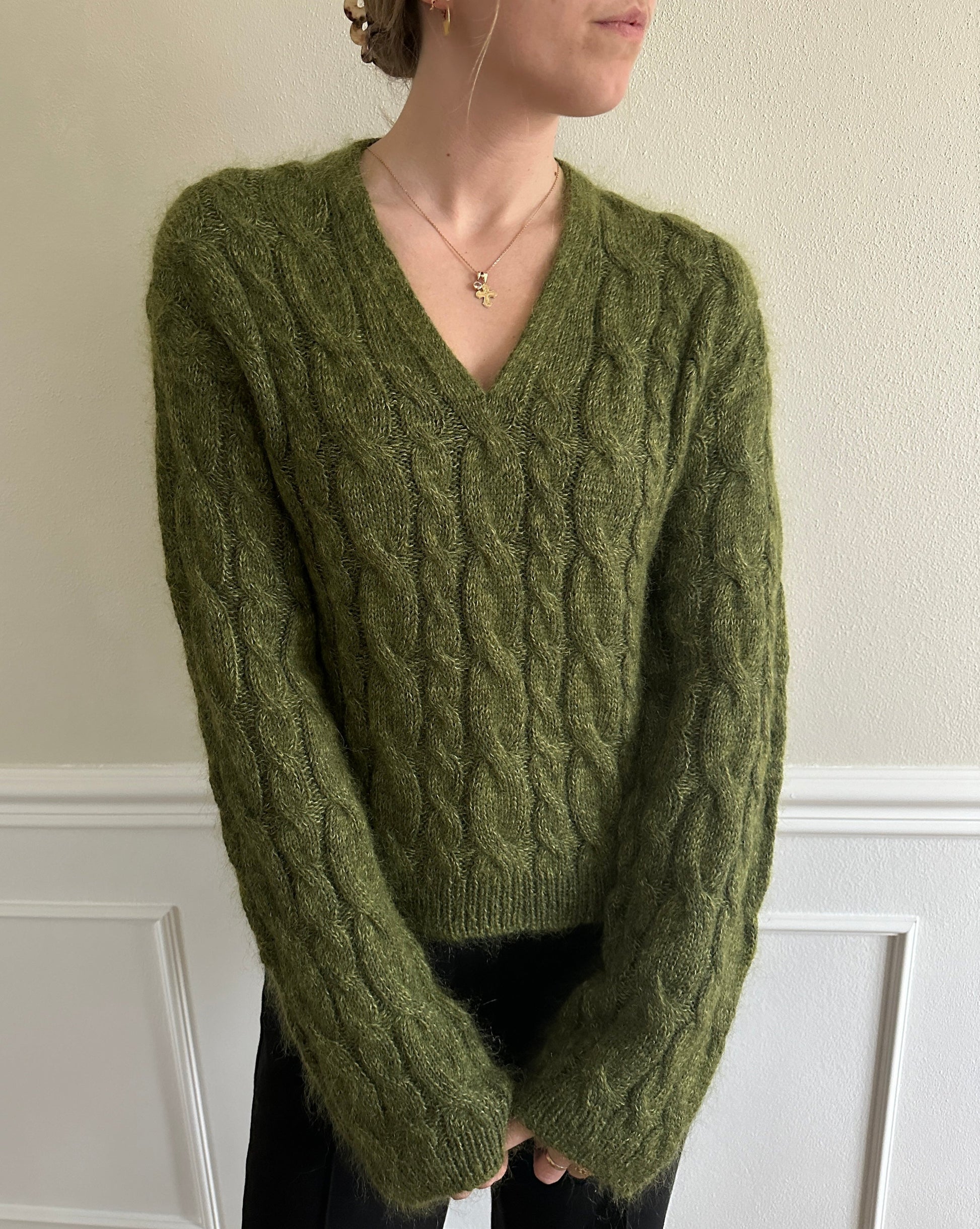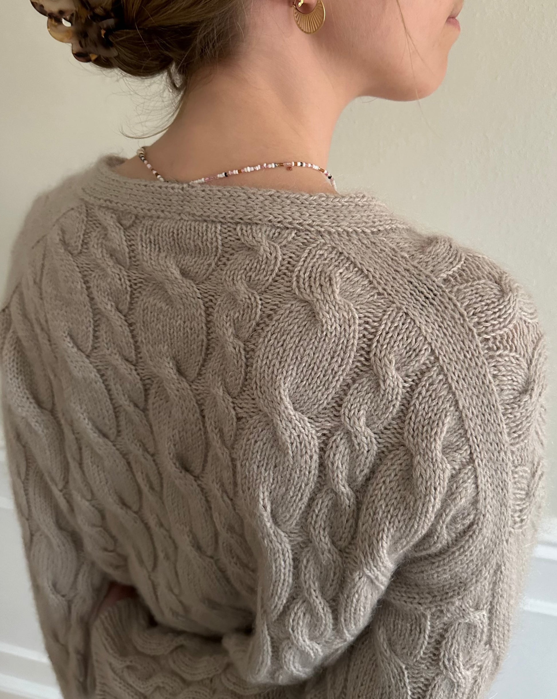 Masker legges opp for ryggstykket, som forlenges mens det gjøres økninger. Deretter plukkes masker opp for forstykkene, som forlenges med økninger. Halskanten strikkes før forstykkene samles. Forstykkene samles med halskanten, hvorpå det kombinerte forstykket forlenges. For- og bakstykke samles for å danne bolen, som avsluttes med en ribbekant. Masker plukkes opp til ermene, som strikkes med flettemønster og avsluttes med ribbekant og italiensk avfelling.