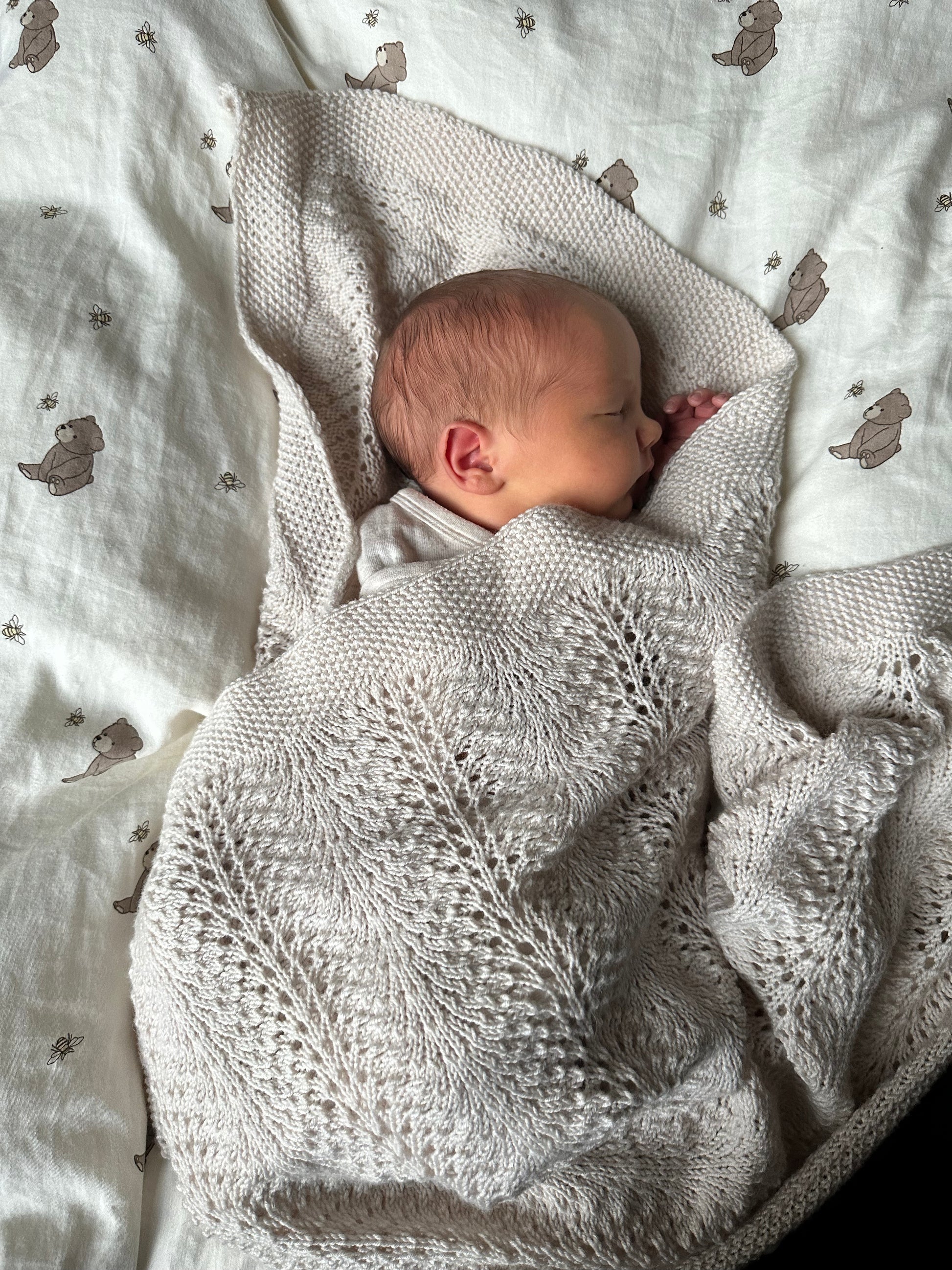 The blanket is knitted flat. Stitches are cast on and a border of seed stitch is worked. Afterwards the lace pattern is worked, while continuing the seed stitch at the beginning and end of each row. The blanket is finished with a border of seed stitch as well.