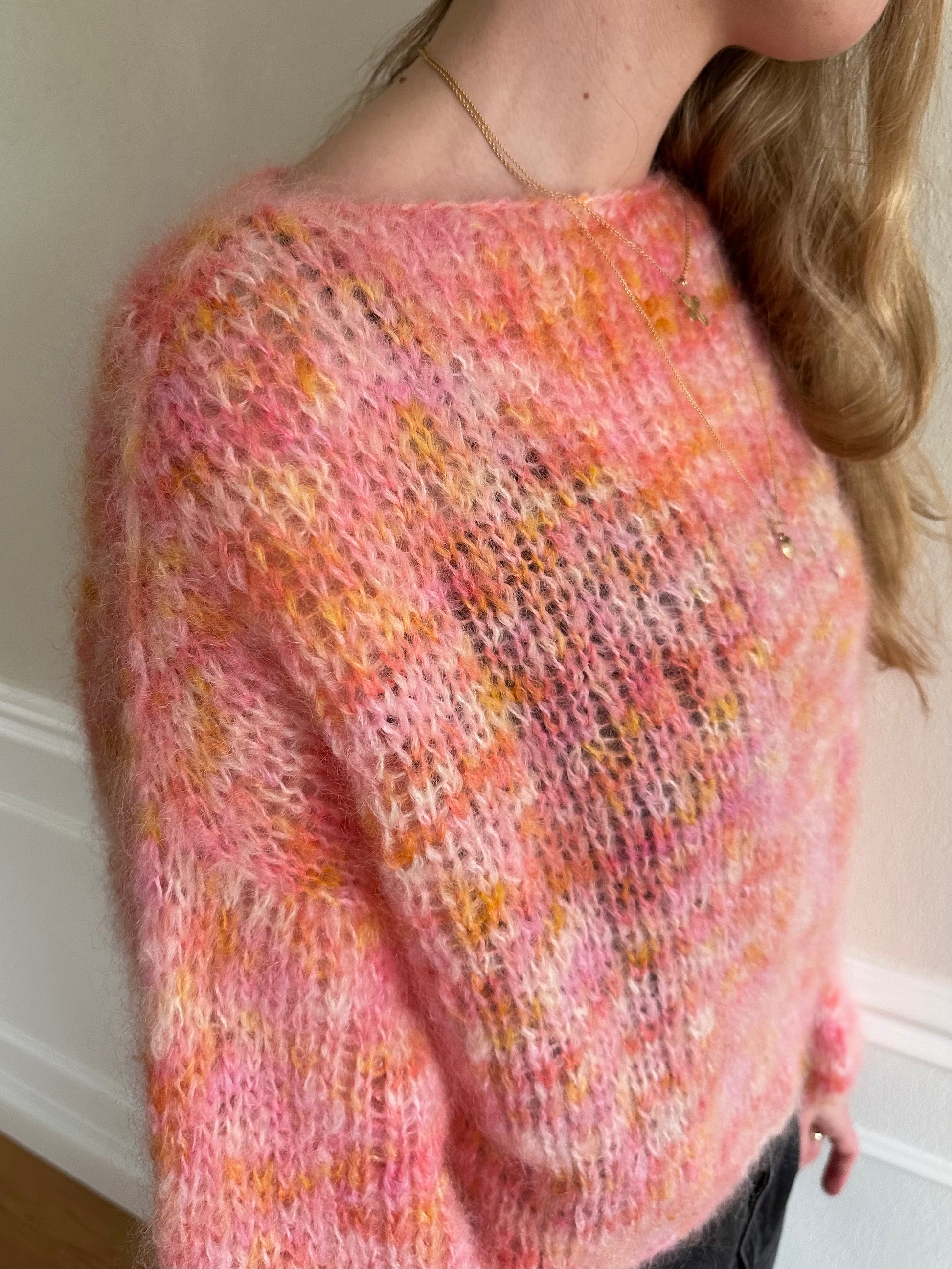 The pink/orange: SassyYarns Fat/chunky Mohair in the colorway Tutti Frutti.