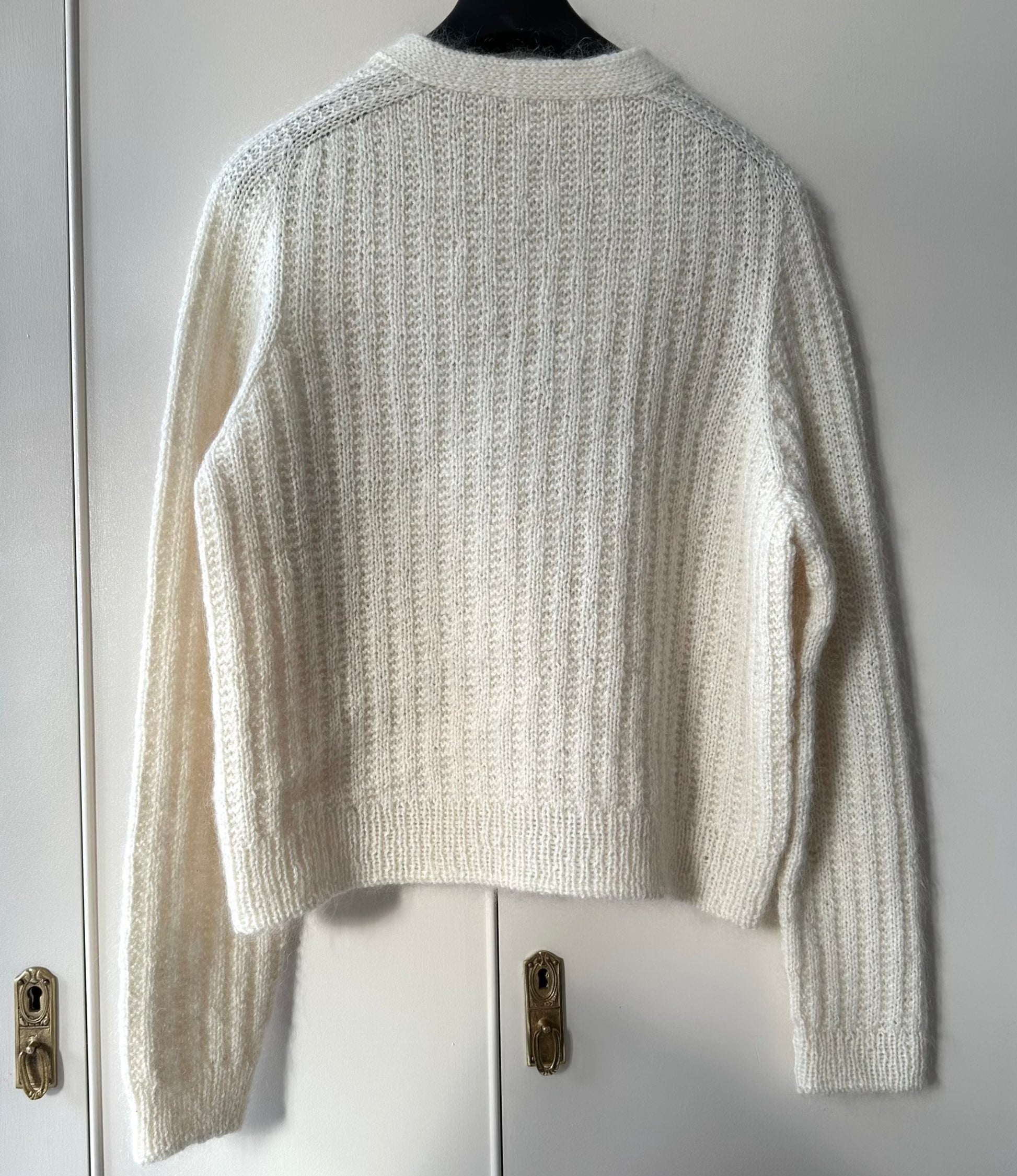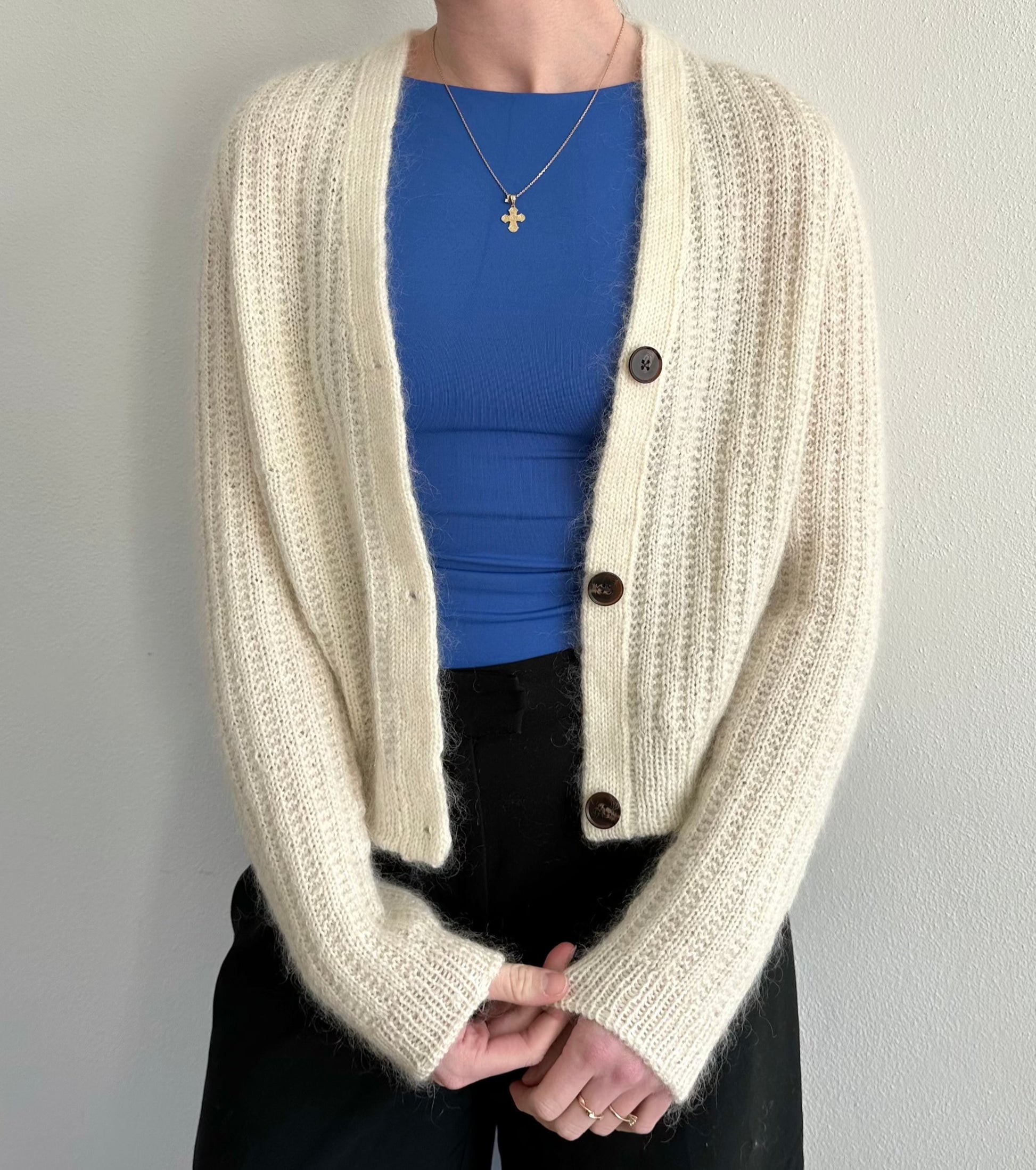 Cardiganen er konstrueret med en saddelskulder. Der slås først masker op til rygstykket, hvorefter der strikkes frem og tilbage, mens skuldrene og halsåbningen skabes gennem udtagninger. Når alle udtagninger til ærmerne er lavet, sættes ærmemaskerne til hvile, mens kroppen forlænges ved at strikke frem og tilbage. I bunden laves en ribkant, som afsluttes med dobbeltstrik og italiensk aflukning.  Ærmemaskerne sættes tilbage på pinden og strikkes i perlerib-mønsteret, mens der laves indtagninger og afsluttes med en ribkant og italiensk aflukning. Afslutningsvist skal knapstolpen strikkes, ved at samle masker op langs halskanten og siderne, som strikkes i dobbeltstrik, mens der undervejs laves knaphuller.