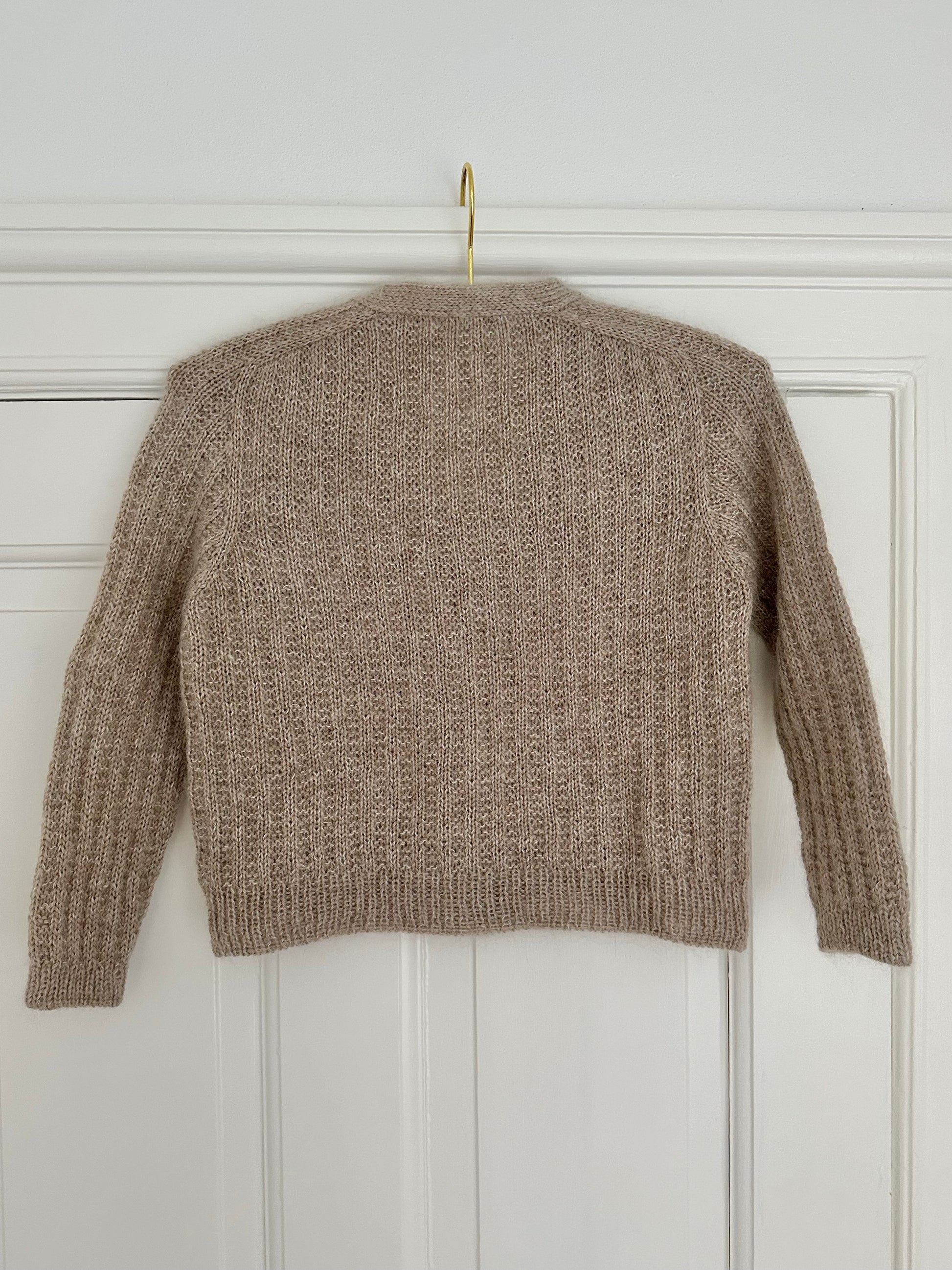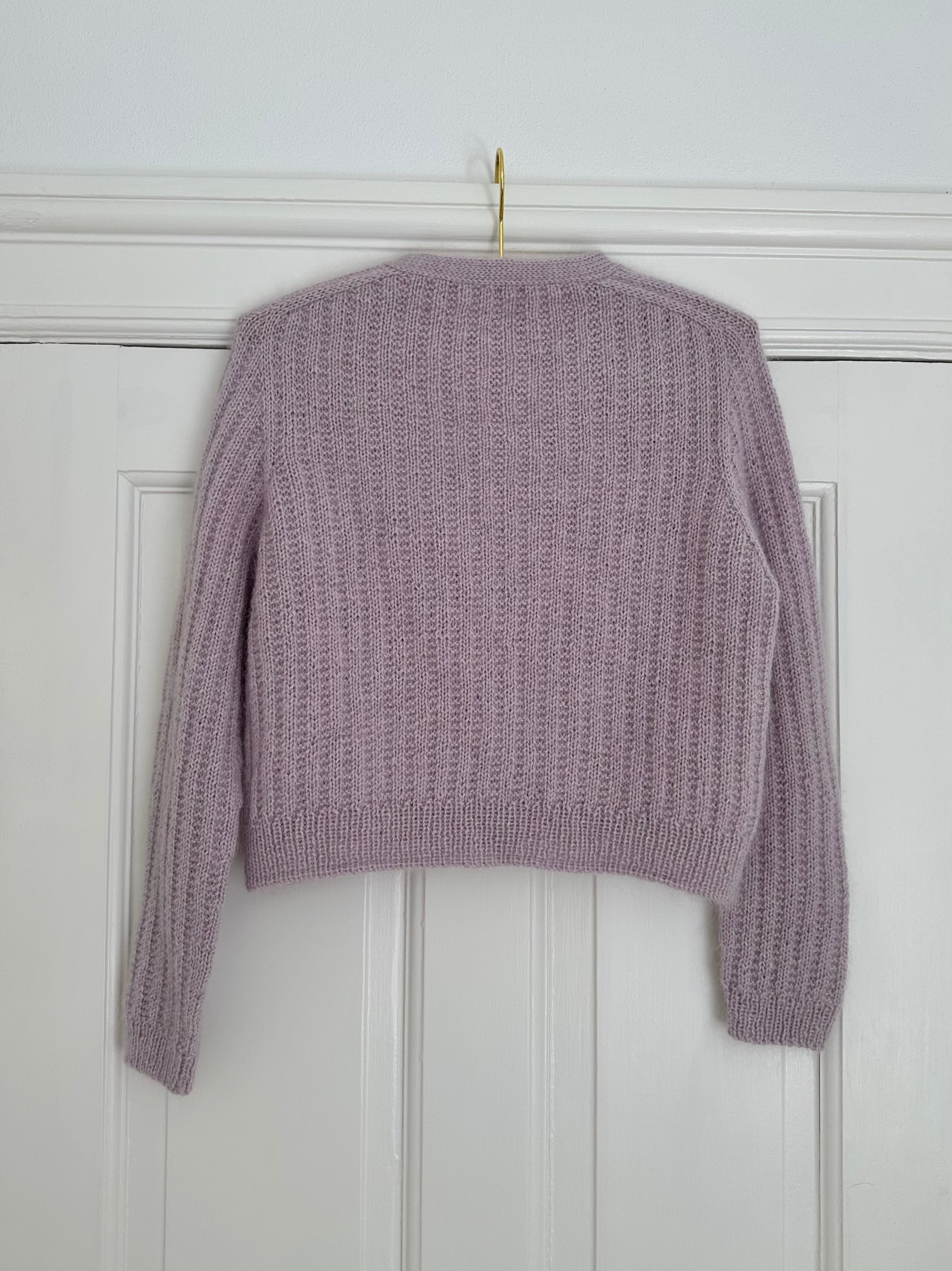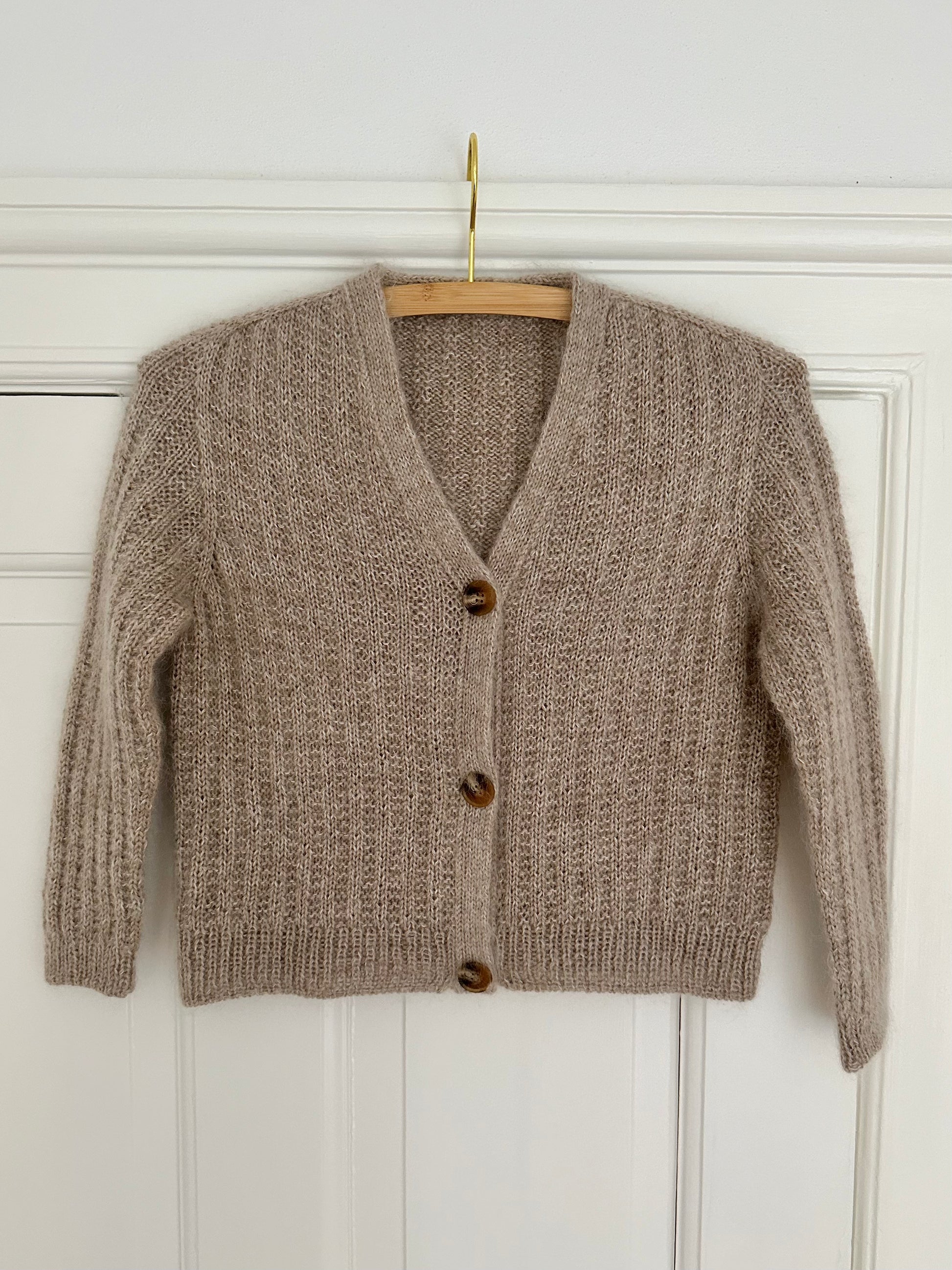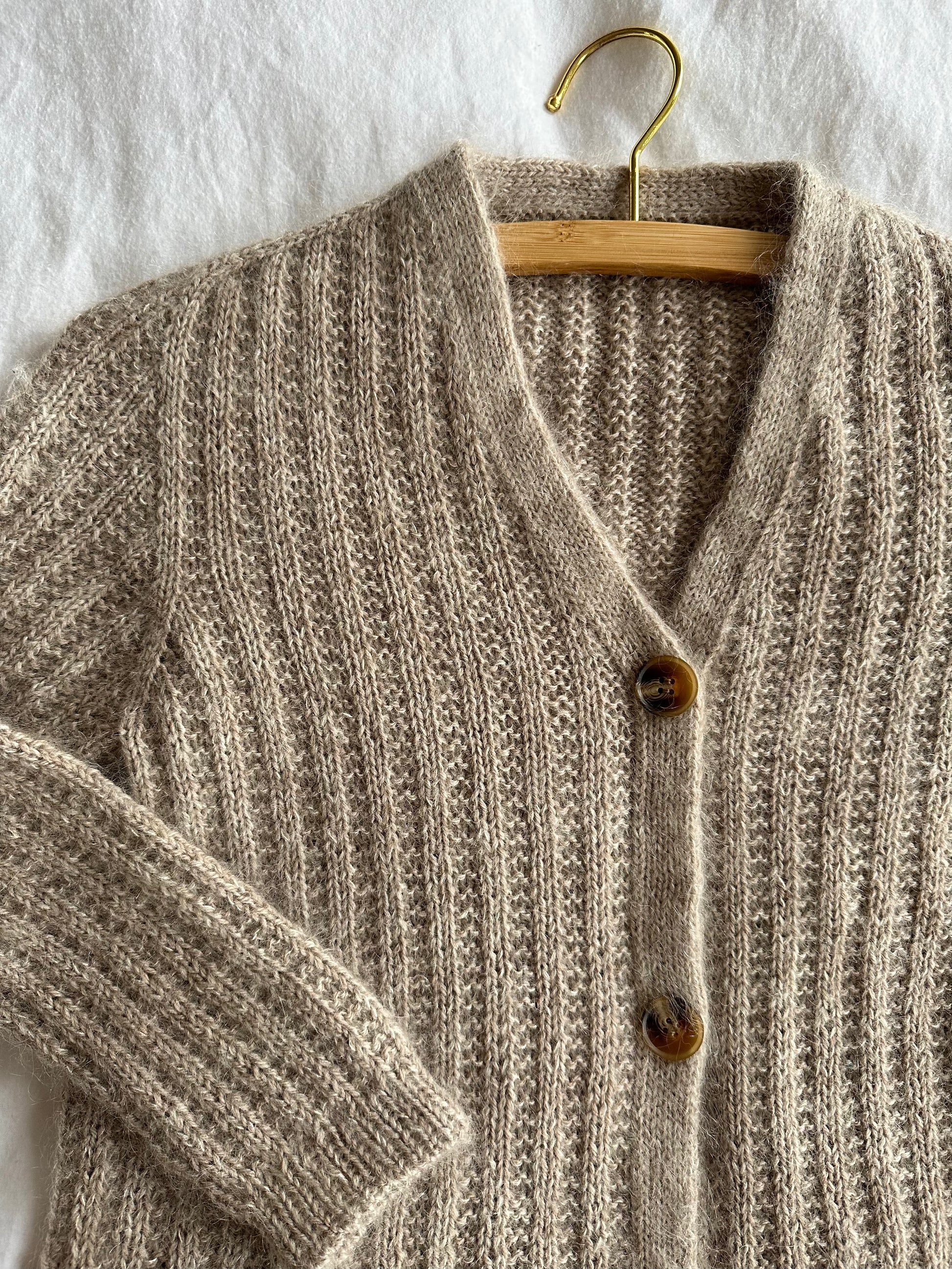 Denne cardigan er konstrueret med en saddelskulder, hvor der først slås masker op til rygstykket, hvorefter der strikkes frem og tilbage, mens skuldrene og halsåbningen skabes gennem udtagninger. Når bærestykket er færdigstrikket, sættes masker af til ærmer. Kroppen afsluttes med en ribkant og italiensk aflukning. Ærmemaskerne sættes tilbage på pinden og strikkes i perlerib-mønsteret, mens der laves indtagninger undervejs og afsluttes med en ribkant og italiensk aflukning. Afslutningsvist samles masker op langs hele åbningen og der strikkes en dobbelt-strikket knapstolpe med knaphuller.