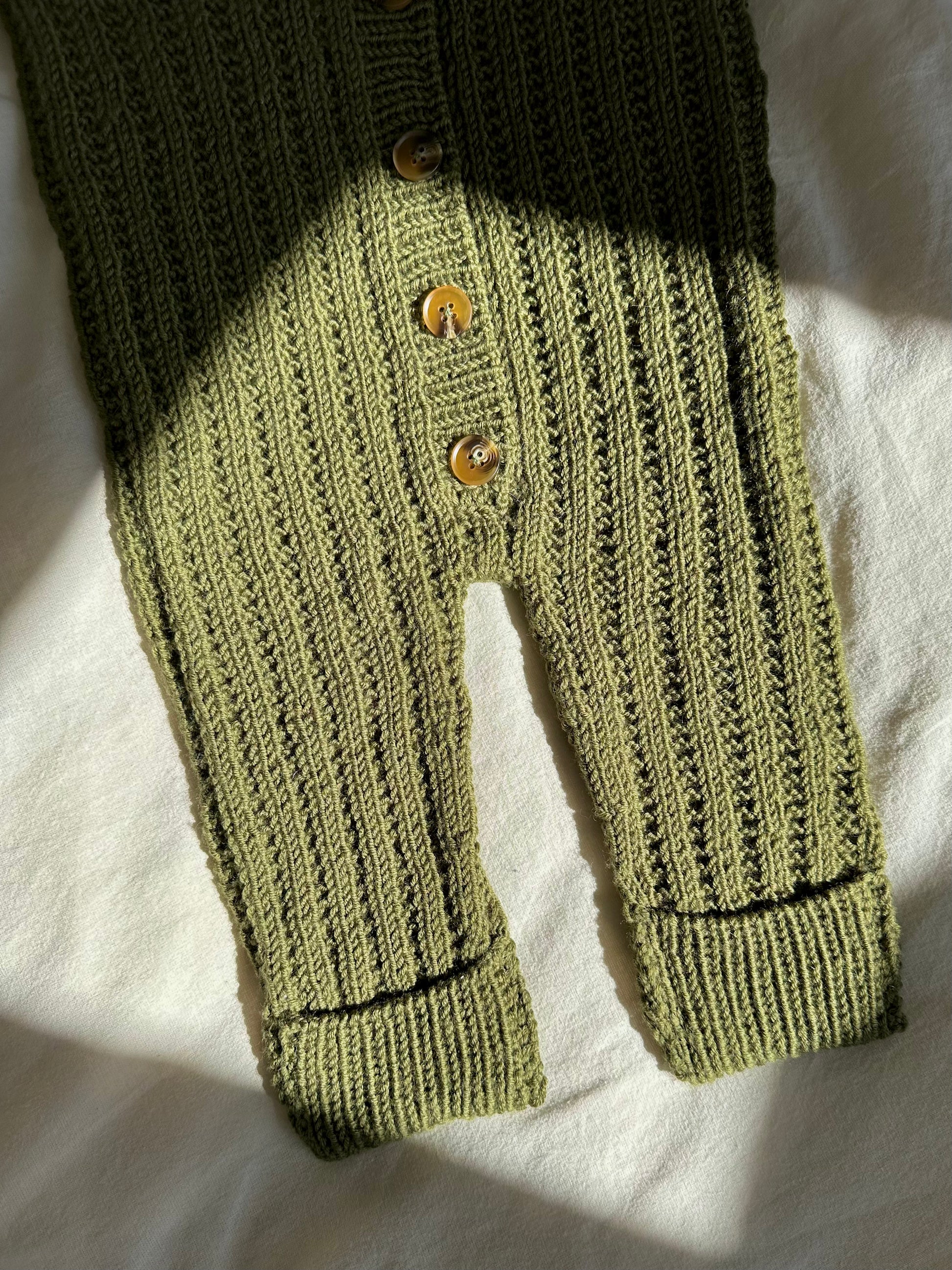 Dragten strikkes oppefra og ned. Der slås masker op til hætten, som strikkes frem og tilbage på pinden. Der samles herefter masker op på hver side, og hætten forsættes. Der laves indtagninger for at skabe nakken, og herefter raglan udtagninger på bærestykket. Der slås masker op i ærmegabet, og kroppen forlænges. Herefter samles kroppen, for atter at blive delt til de to ben. Benene strikkes rundt på pinden, mens der laves indtagninger. I bunden af både ben og arme strikkes en lap, der efterfølgende syes ned. Ærmerne strikkes ligeledes rundt på pinden med indtagninger. Afslutningsvist strikkes en knapstolpe med knaphuller, og der sættes knapper på.