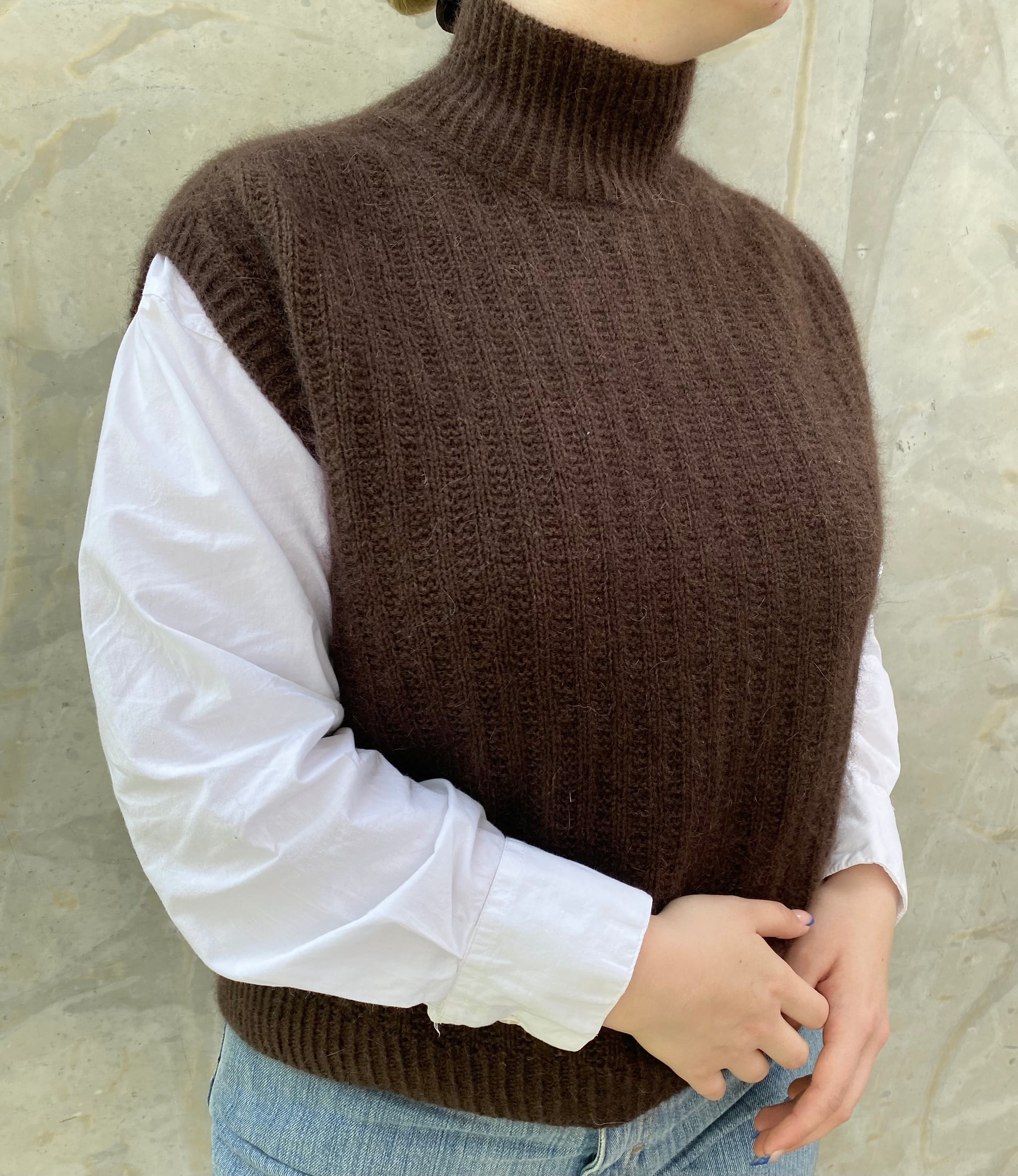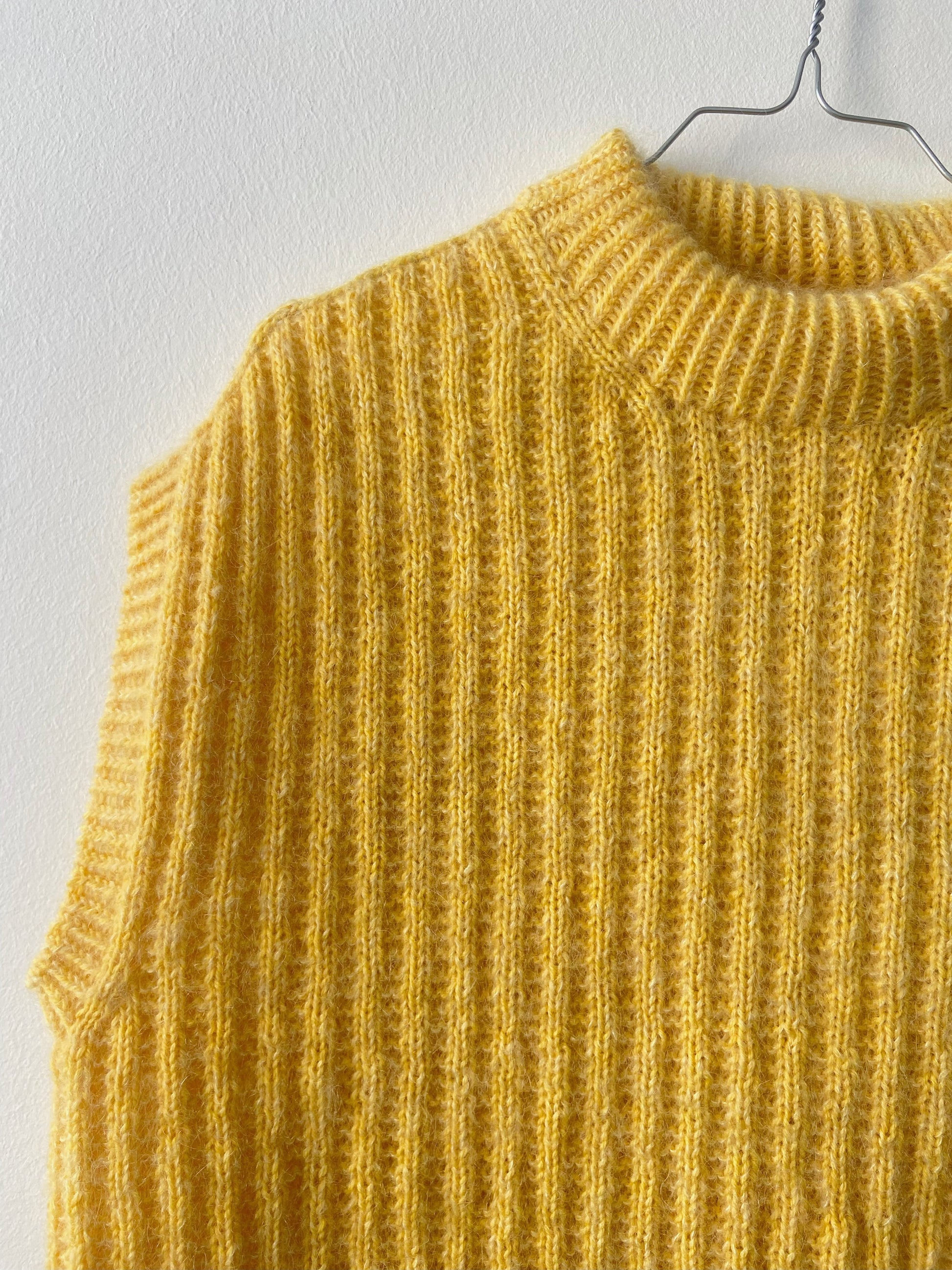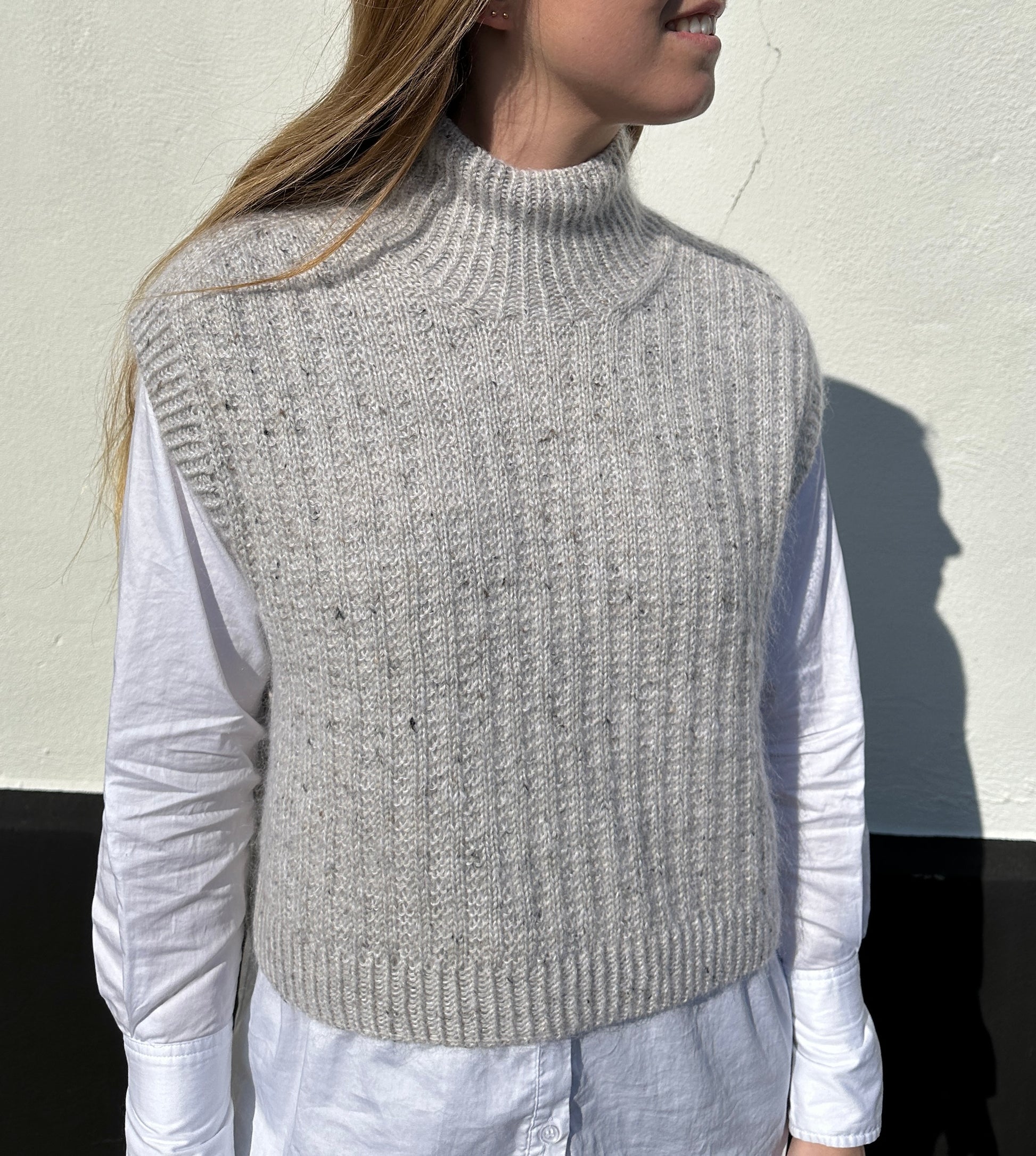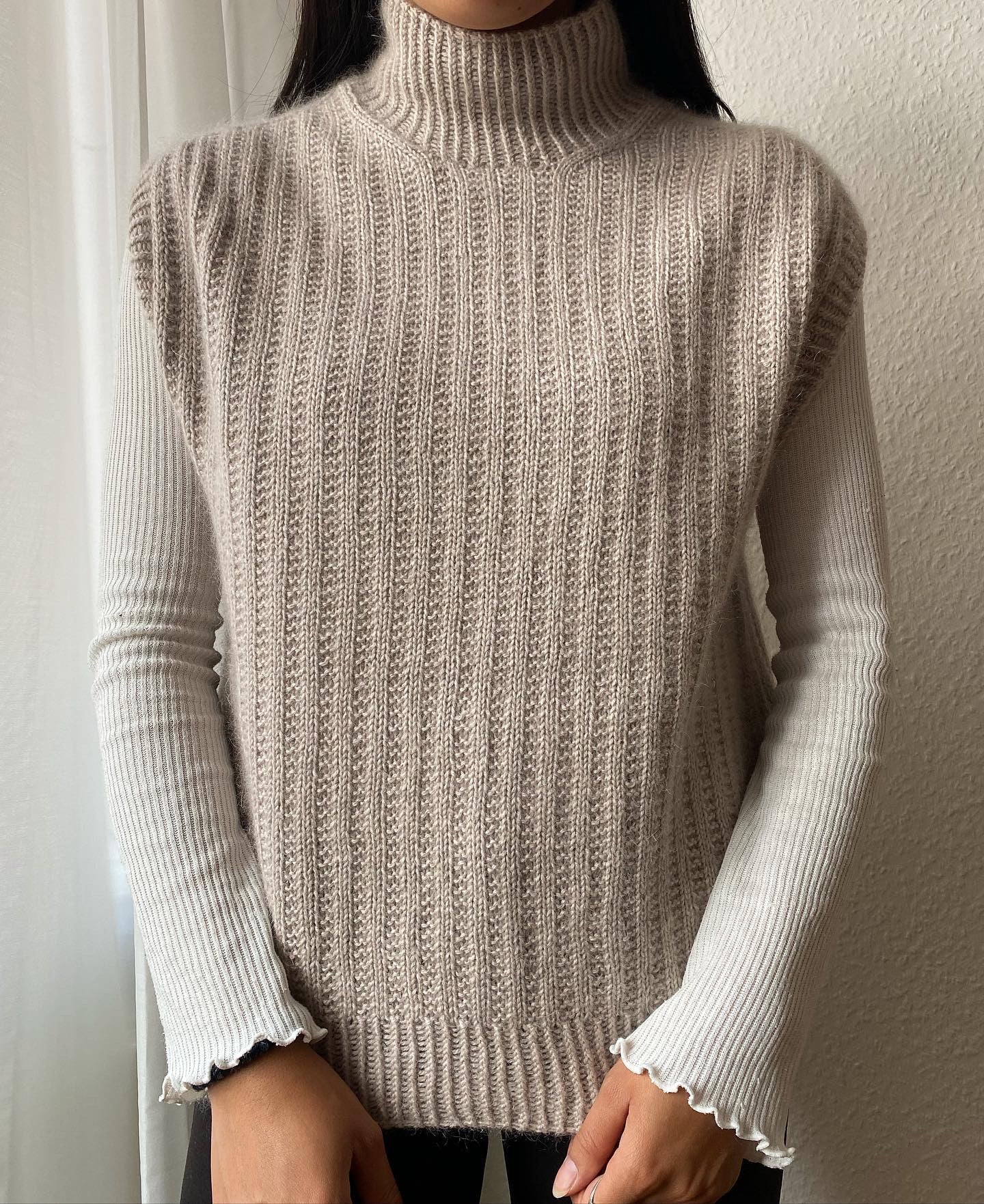 Denne slipover er konstrueret med en saddelskulder, hvor der først slås masker op til rygstykket, hvorefter der strikkes frem og tilbage mens skuldrene og halsåbningen skabes gennem udtagninger. Når bærestykket er samlet og strikket færdigt, deles arbejdet, så for- og bagstykket strikkes hver for sig. Kroppen samles igen mens ærmegabene afgrænses og strikkes færdig på rundpind, hvorved længden af slipoveren kan tilpasses. Kroppen afsluttes med en drejet ribkant og dobbeltstrik. Der samles herefter masker op i halsåbningen, som strikkes i drejet rib og afsluttes med dobbeltstrik. Afslutningsvist samles masker op i ærmegabene, som ligeledes strikkes i drejet rib og afsluttes med dobbeltstrik og italiensk aflukning.