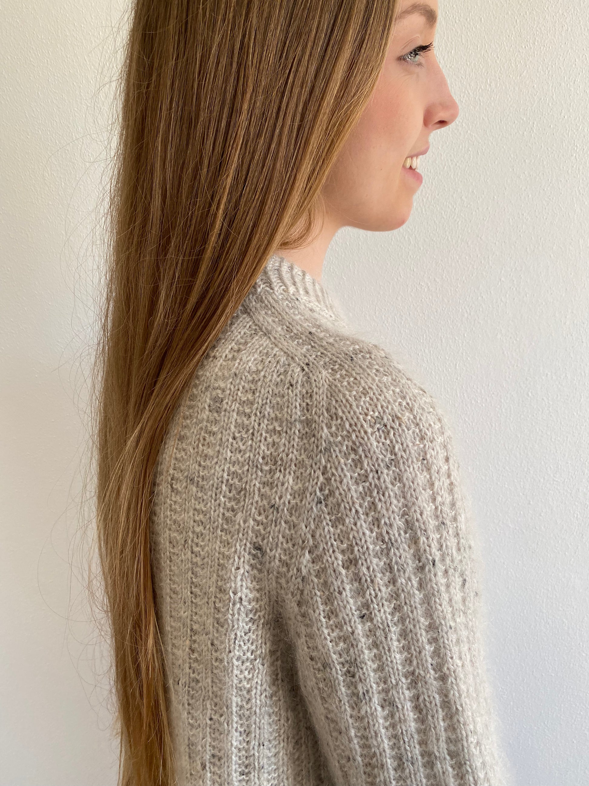 Denne sweater er konstrueret med en saddelskulder, hvor der strikkes frem og tilbage mens skuldrene og halsåbningen skabes gennem udtagninger. Kroppen strikkes færdig på rundpind, hvorved længden af sweateren kan tilpasses og prøves undervejs. I bunden af kroppen kan der strikkes en slids i hver side af den drejede ribkant, hvis det ønskes. Ærmerne strikkes i rib-mønsteret og afsluttes med en lang drejet ribkant og italiensk aflukning. Afslutningsvist strikkes en halskant i drejet rib, der foldes til en dobbelt halskant.