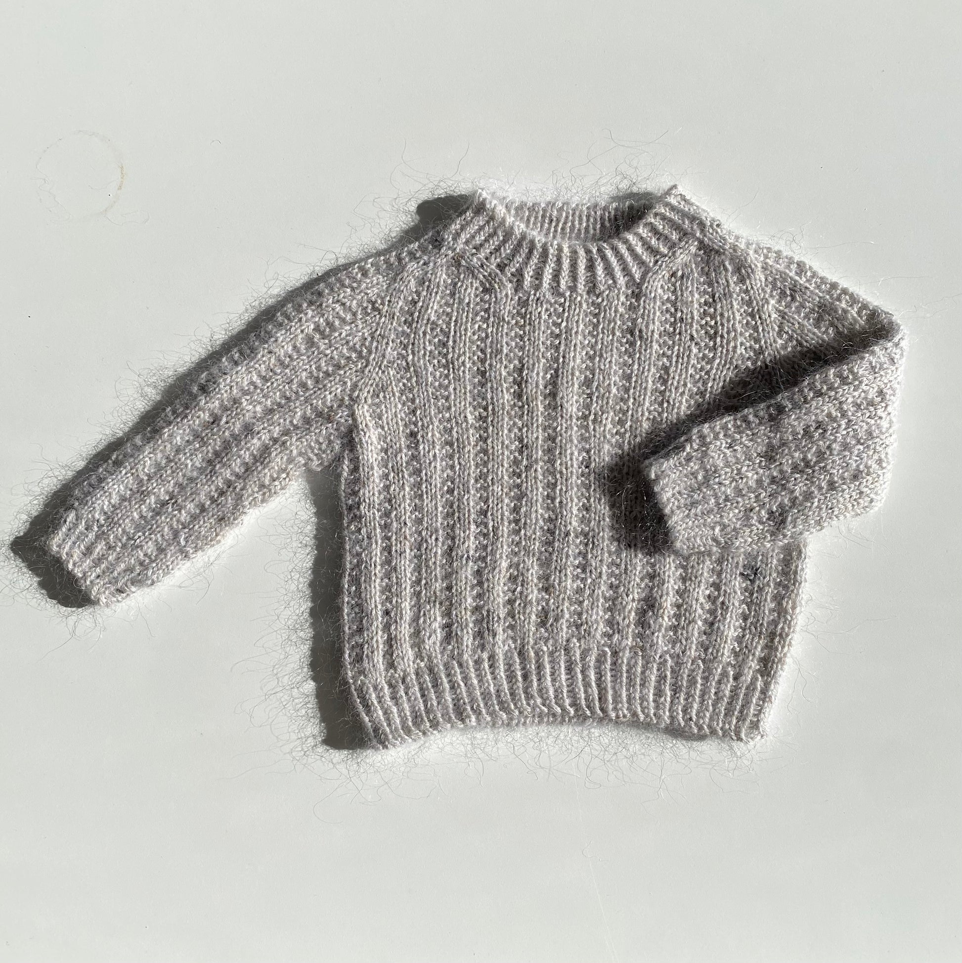 Denne sweater er konstrueret med en saddelskulder, hvor der først slås masker op til rygstykket, hvorefter der strikkes frem og tilbage, mens skuldrene og halsåbningen skabes gennem udtagninger. Når bærestykket er færdigstrikket, sættes masker af til ærmerne. Kroppen samles og strikkes færdig på rundpind, hvorved længden af sweateren kan tilpasses. Ærmemaskerne sættes tilbage på pinden og strikkes i perlerib-mønsteret, mens der laves indtagninger undervejs og afsluttes med en drejet ribkant og italiensk aflukning. Afslutningsvist samles masker op i halsåbningen som strikkes i drejet rib, der enten afsluttes med italiensk aflukning eller syes ned som en dobbelt ribkant.