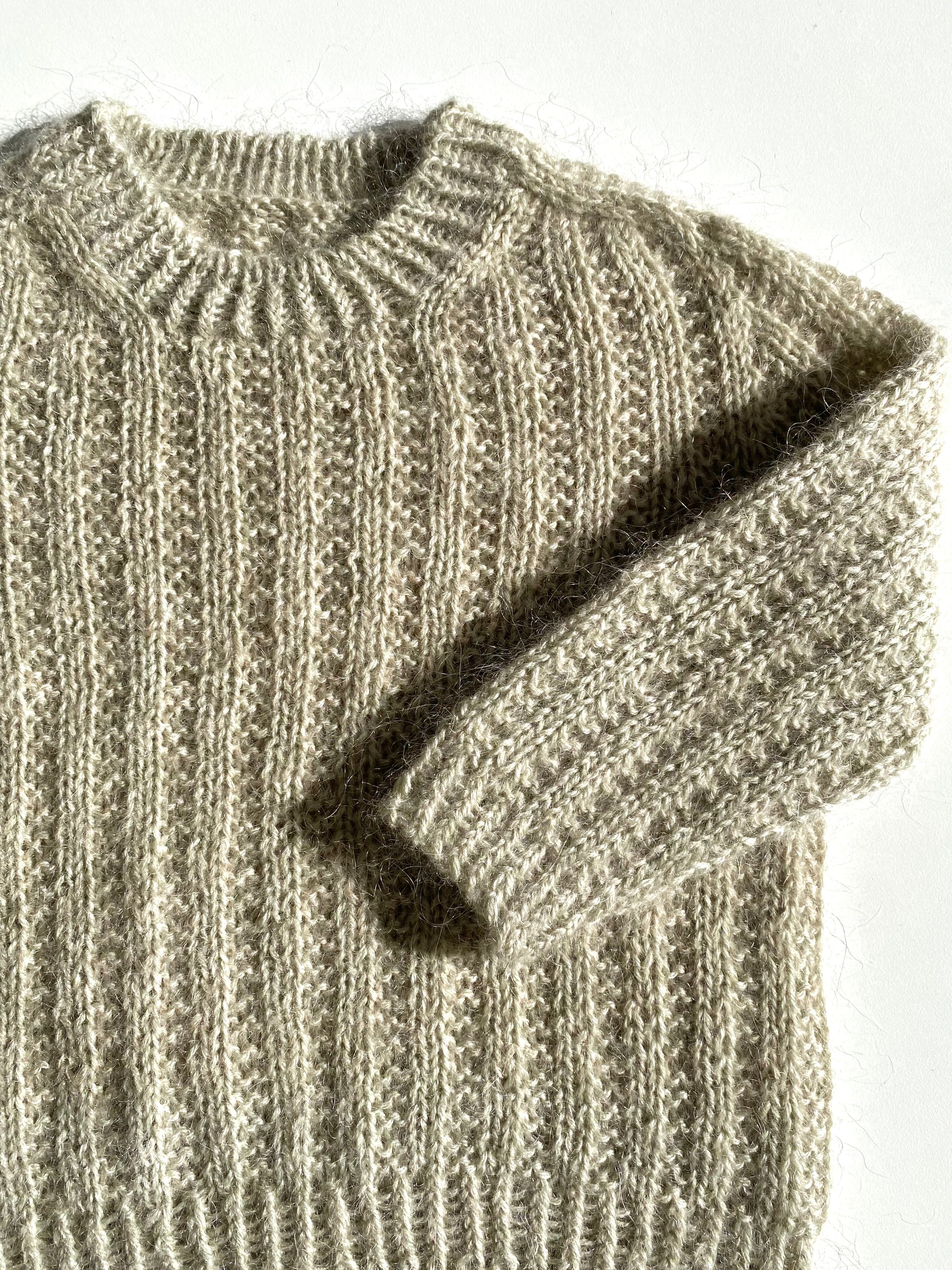 Cardamom sweater is worked from the top down. First, stitches are cast on and increases are made on both the right and wrong side while working flat to create a contiguous shoulder construction. Increases are also made to shape the edge of the neck, whereafter the two shoulders are joined to form the front part of the sweater. From here on the sweater is worked in the round. Increases are continuously made in different positions to give the sweater the detailed lines between the body and sleeves before the stitches are parted for sleeves and body. The body is continued and finished with a twisted rib edge and Italian cast-off. The sleeves are then worked in double broken rib with decreases throughout and finished with twisted rib edges. Finally, stitches are picked up at the edge of the neck and worked in twisted rib and finished with an Italian cast-off.