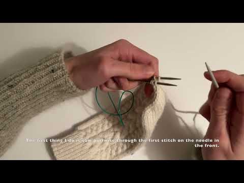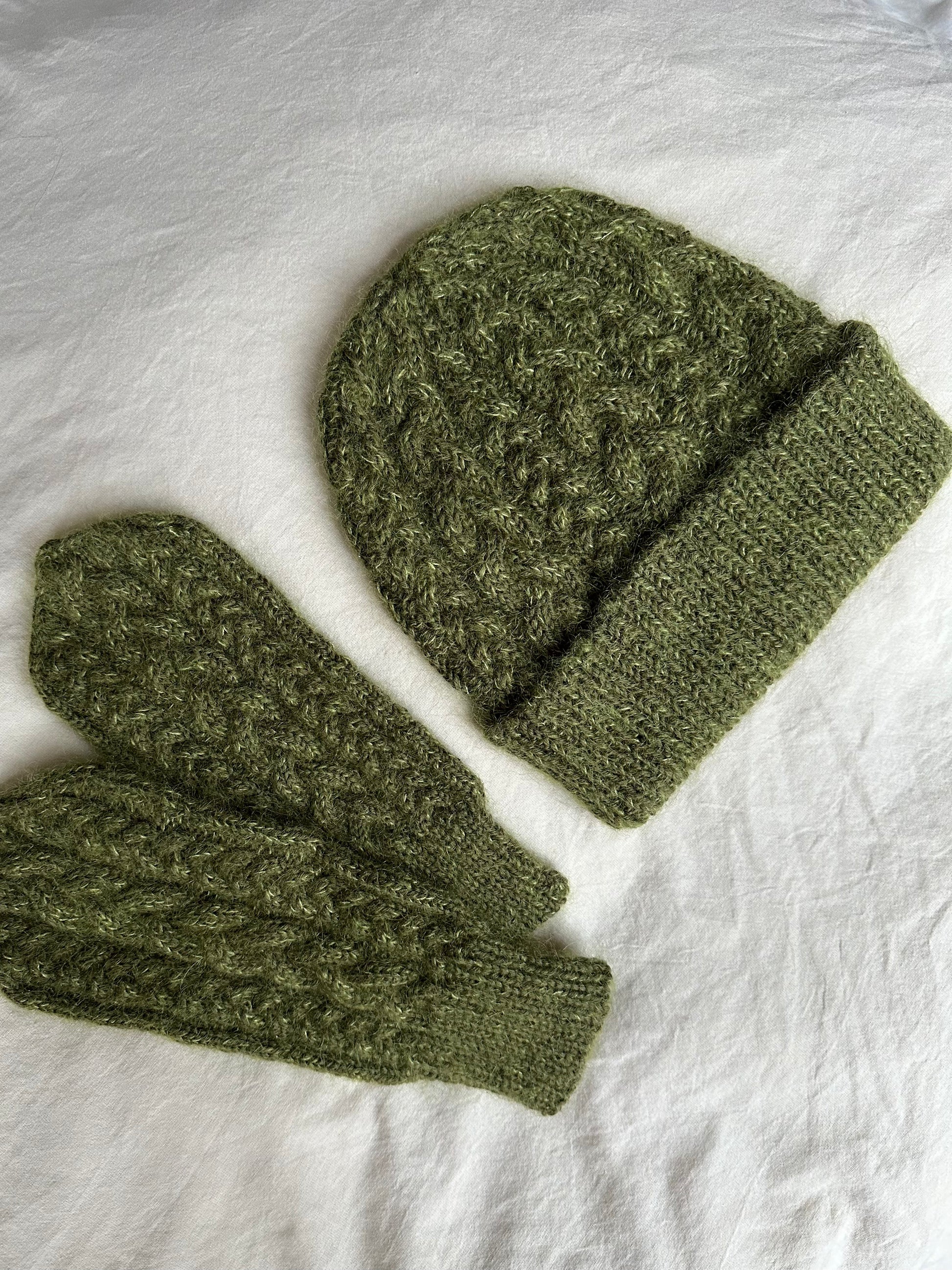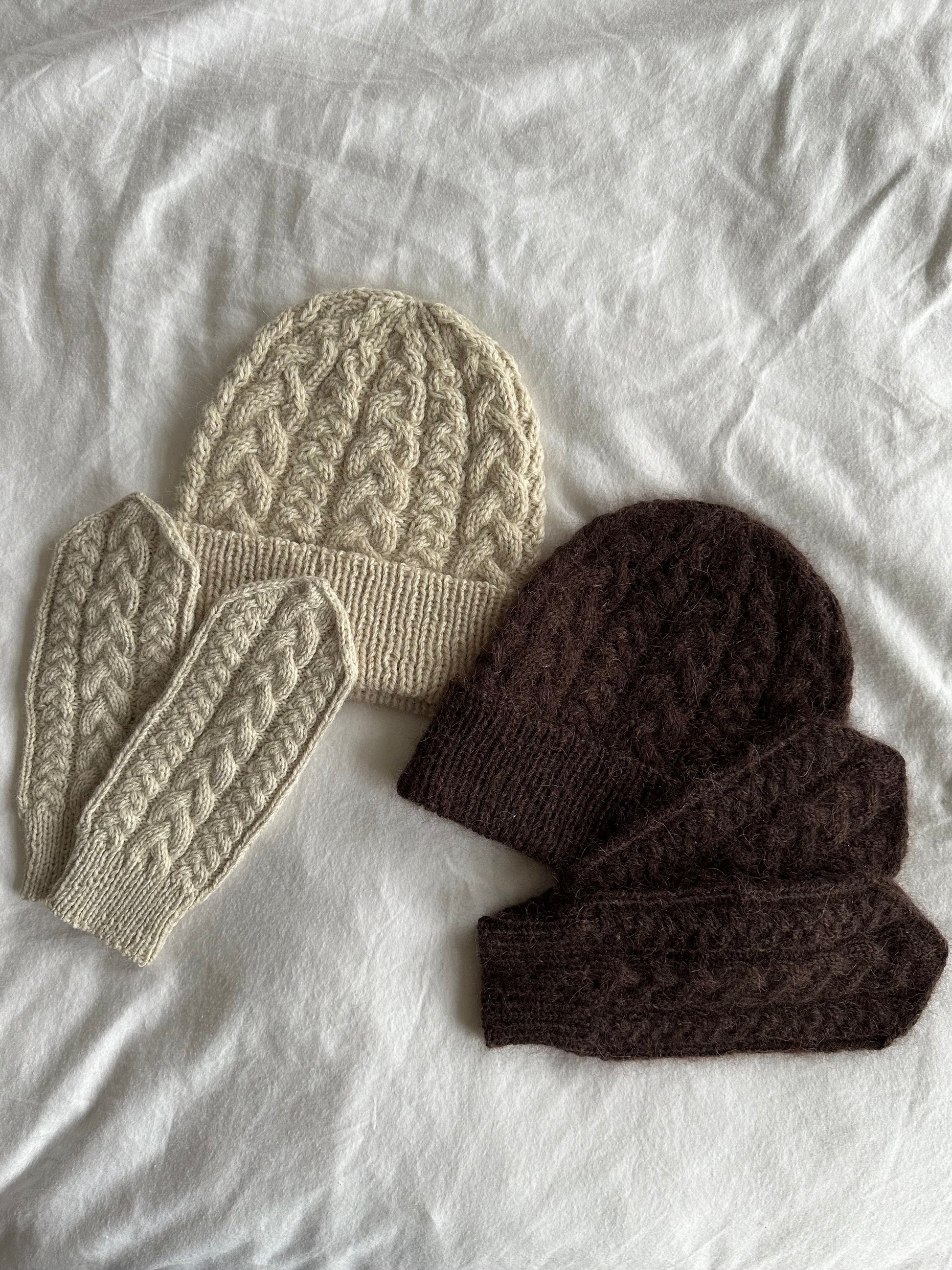 The mittens are knitted from the cuff towards the fingertips. Stitches are cast on with Italian cast-on and worked in the round.The cable-pattern is worked on the front side of the mittens while the backside is worked in stockinette stitch. A hole for the thumb is made along the way. Decreases are made towards the end of the mitten and the last stitches are closed with Garter stitches. Finally, the thumb is worked by picking up stitches, working in stockinette stitch in the round and doing increases at the end.