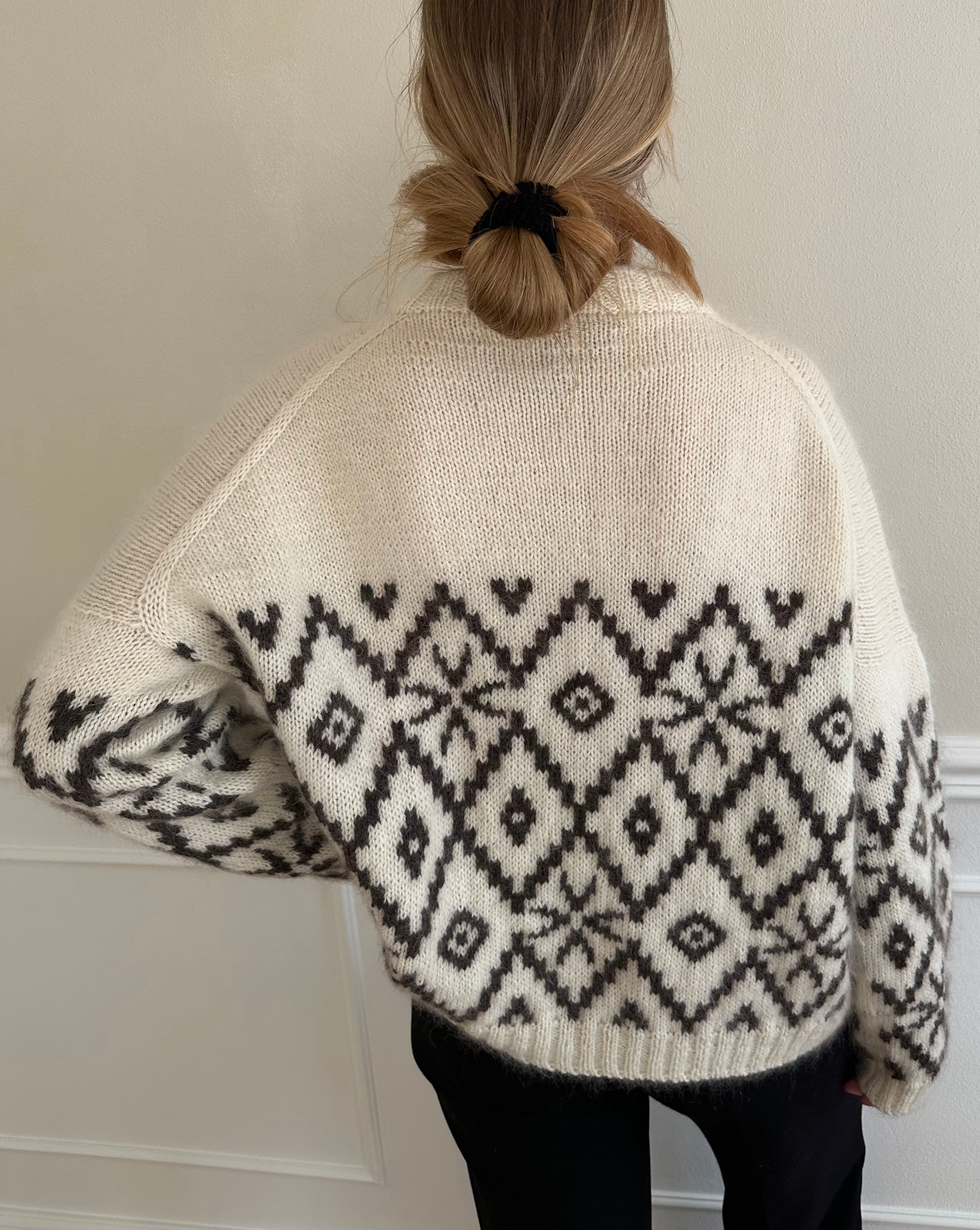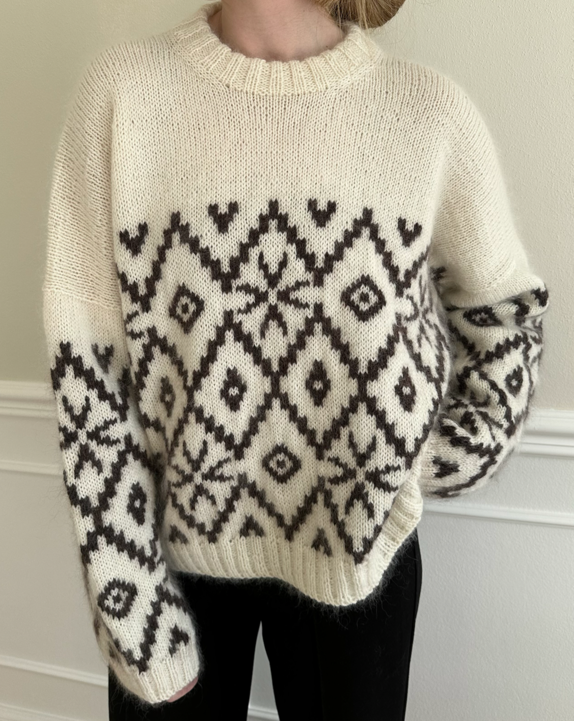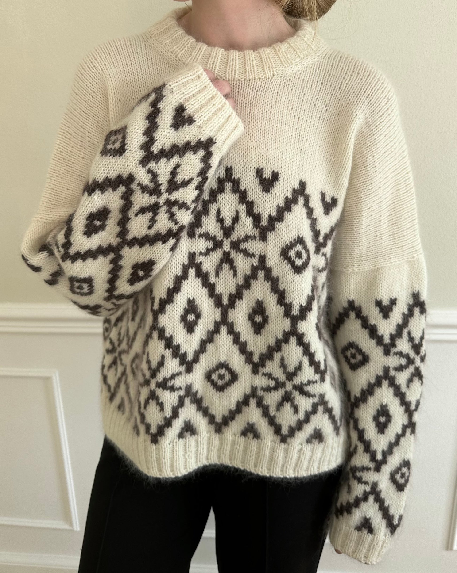 The sweater can be knitted in three different sizes: XS-M (M-XL) 2XL-4XL which corresponds to a bust circumference of 75-95 (95-110) 110-140 cm. The circumference of the finished sweater is 109 (127) 145 cm, and we recommend a positive ease between 10 and 35 cm, depending on which fit is preferred