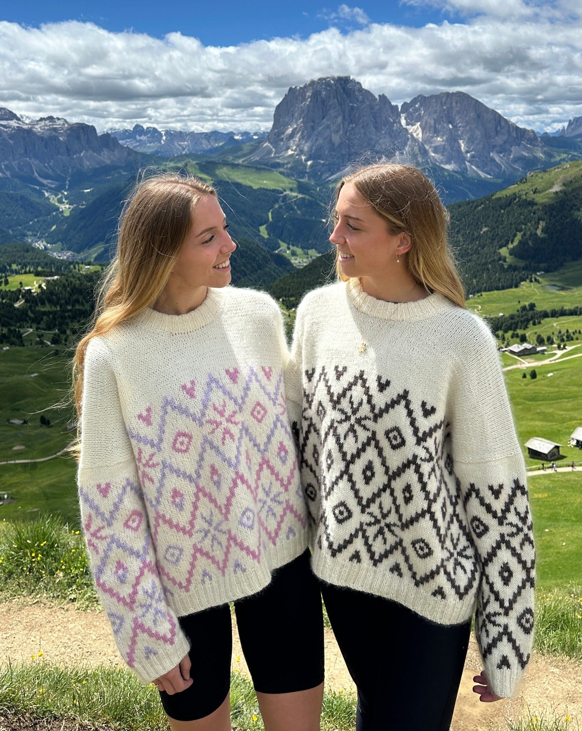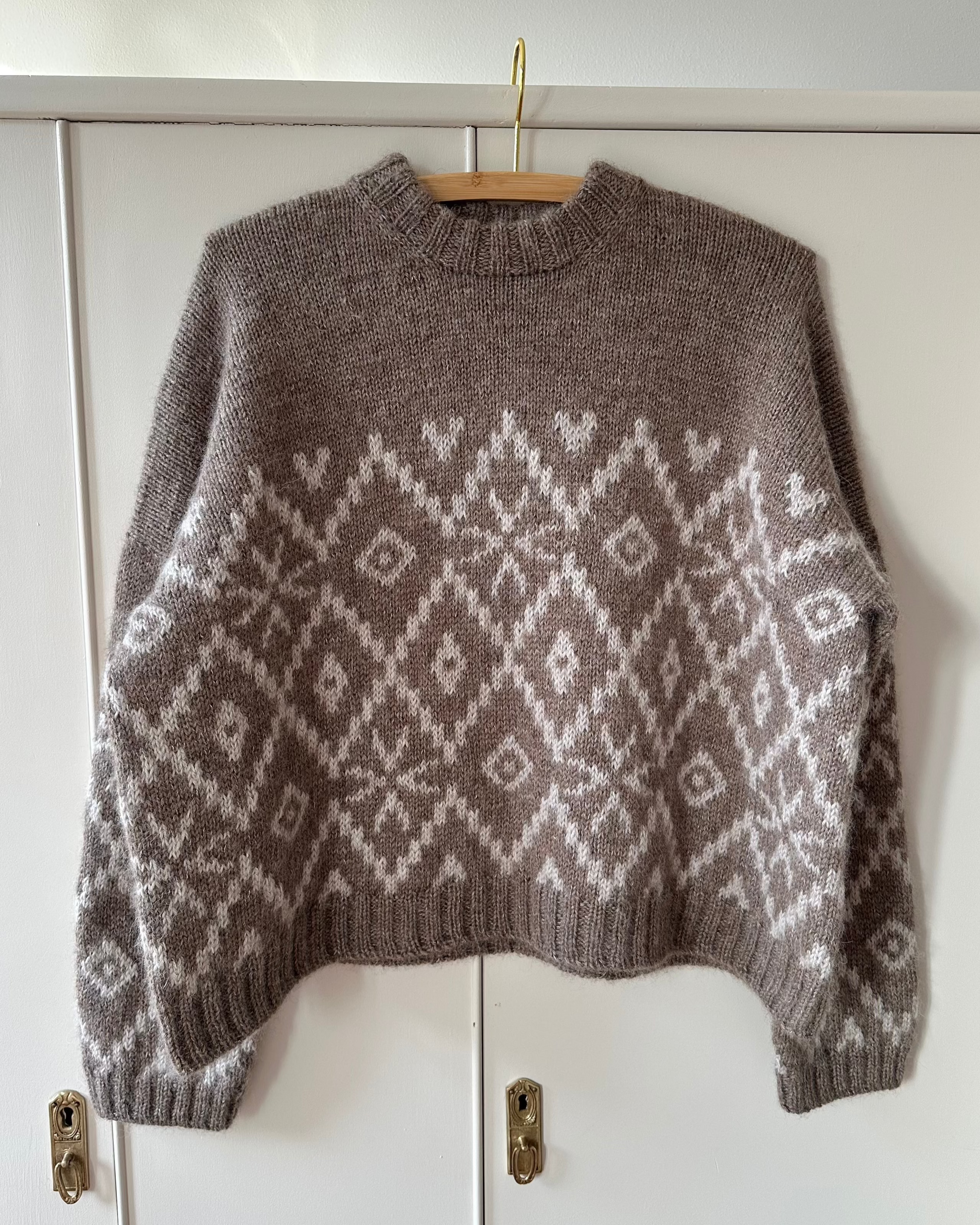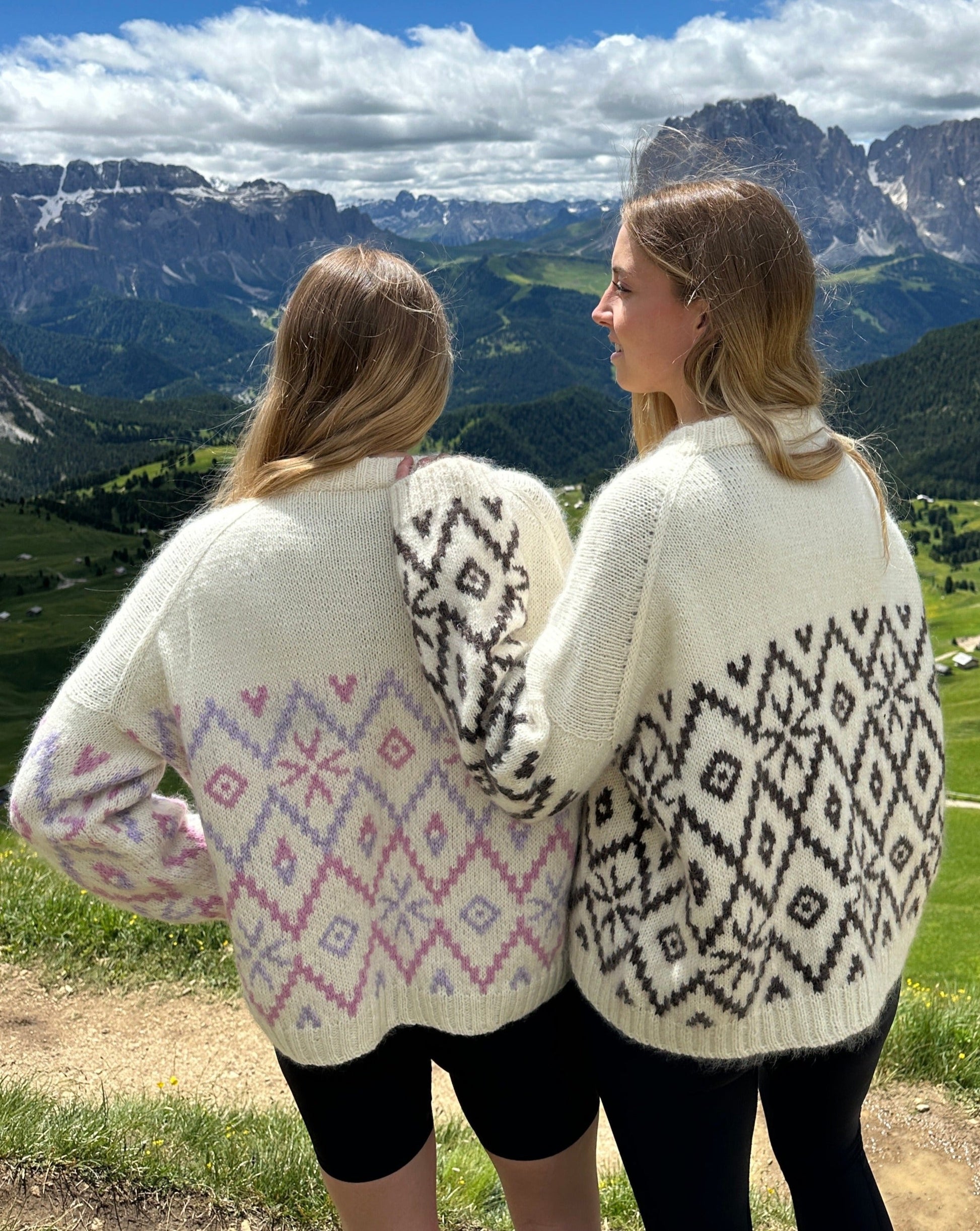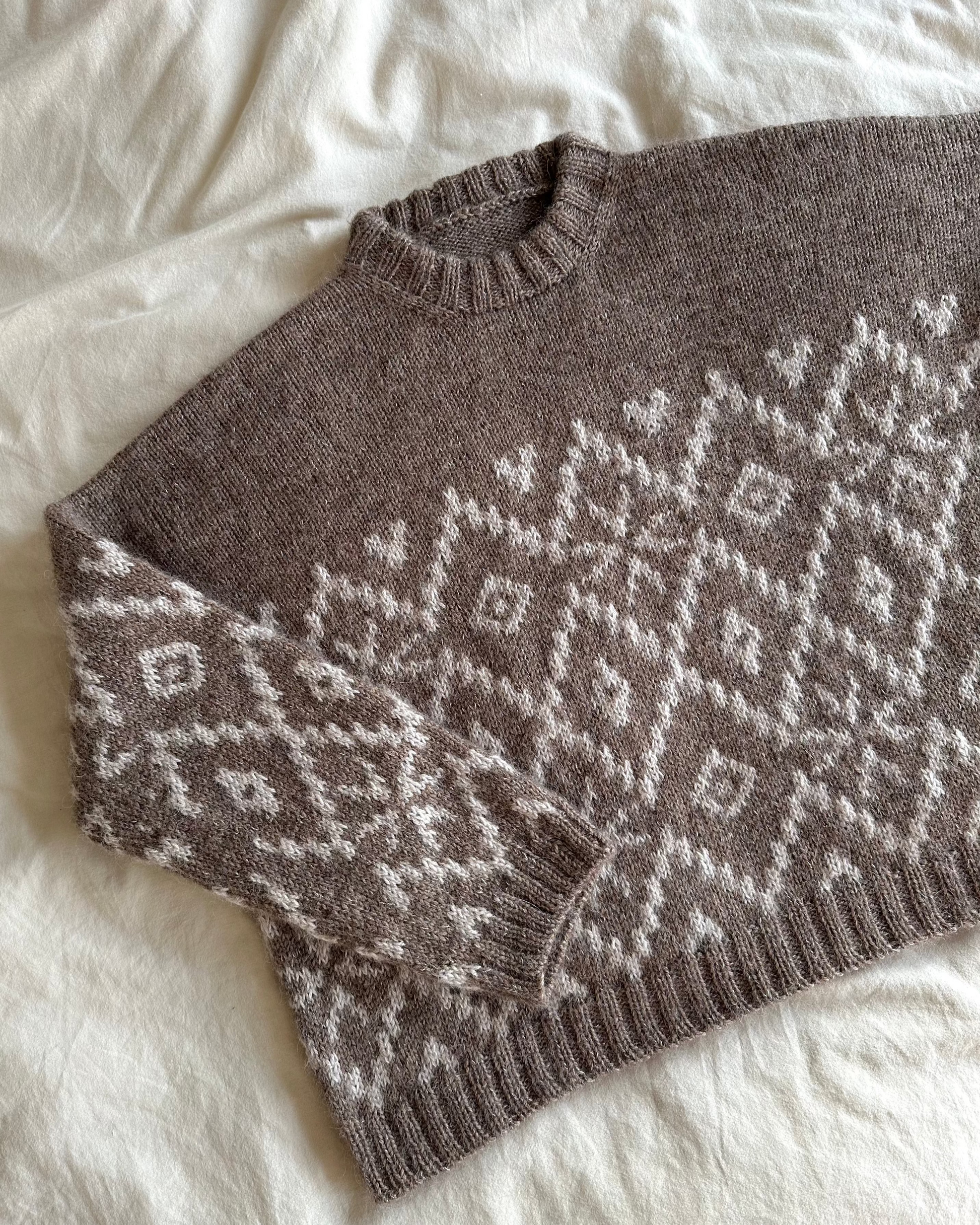 The sweater can be knitted in three different sizes: XS-M (M-XL) 2XL-4XL which corresponds to a bust circumference of 75-95 (95-110) 110-140 cm. The circumference of the finished sweater is 109 (127) 145 cm, and we recommend a positive ease between 10 and 35 cm, depending on which fit is preferred