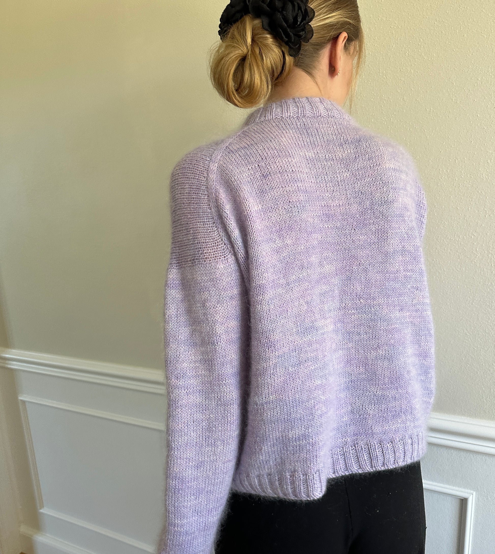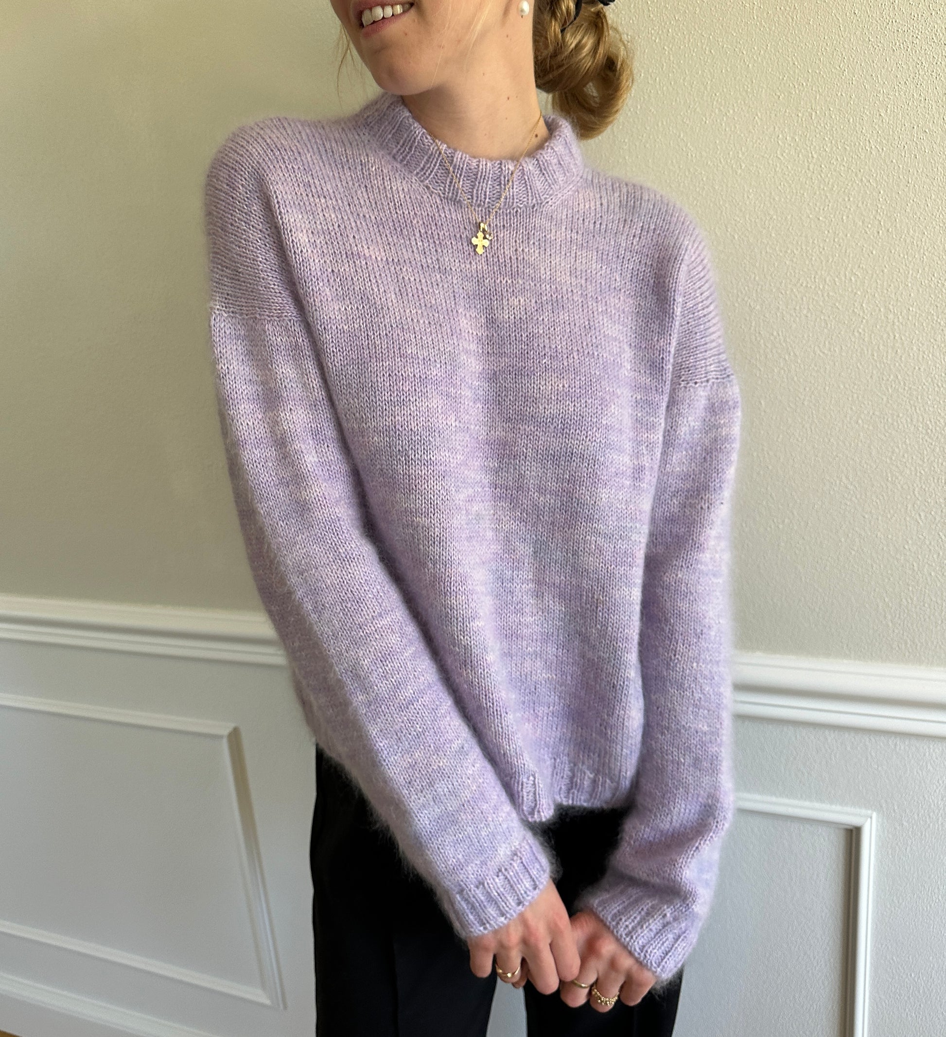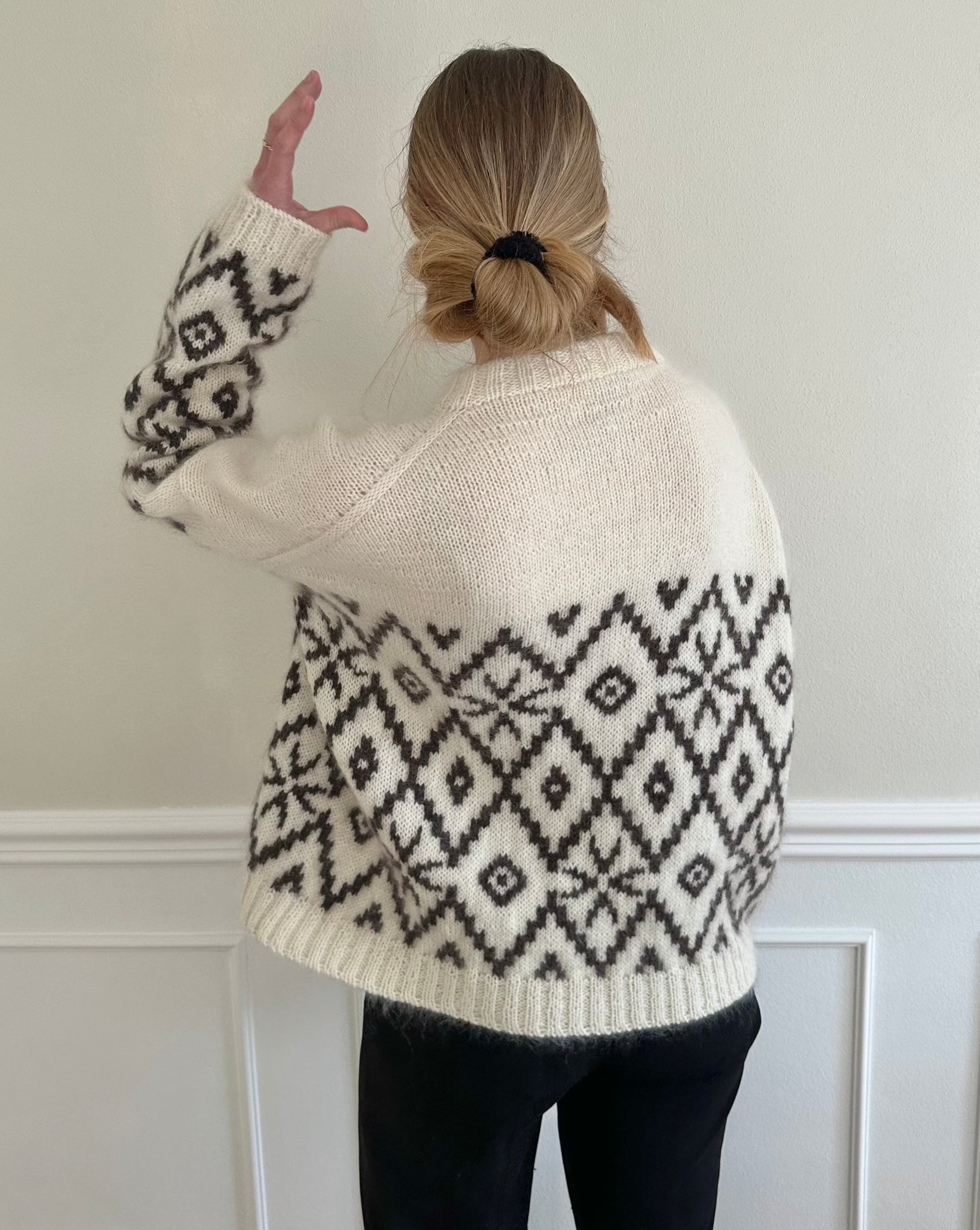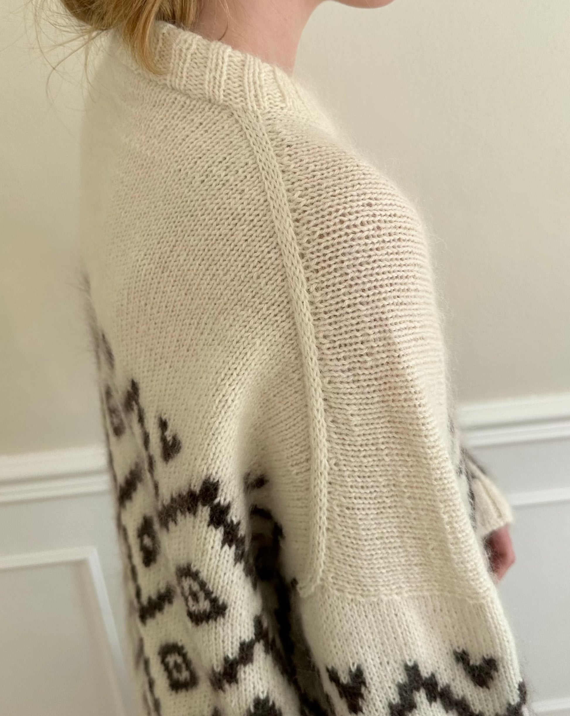 The sweater is knitted from the top down. Stitches are cast on for the back piece, which is knitted flat, while doing increases. Stitches are then picked up along to upper edge of the back, for the left and then the right shoulder. The two shoulder pieces are joined to form the front piece, which is then joined with the back piece to create the body. The body is worked in the round and finished with a double rib. Stitches are picked up along the edge of the neckline and worked in double rib, folded down and knitted into place. Finally, stitches are picked up along the armholes. The sleeves are worked in the round, with decreases at the underside and finished with double ribbing.