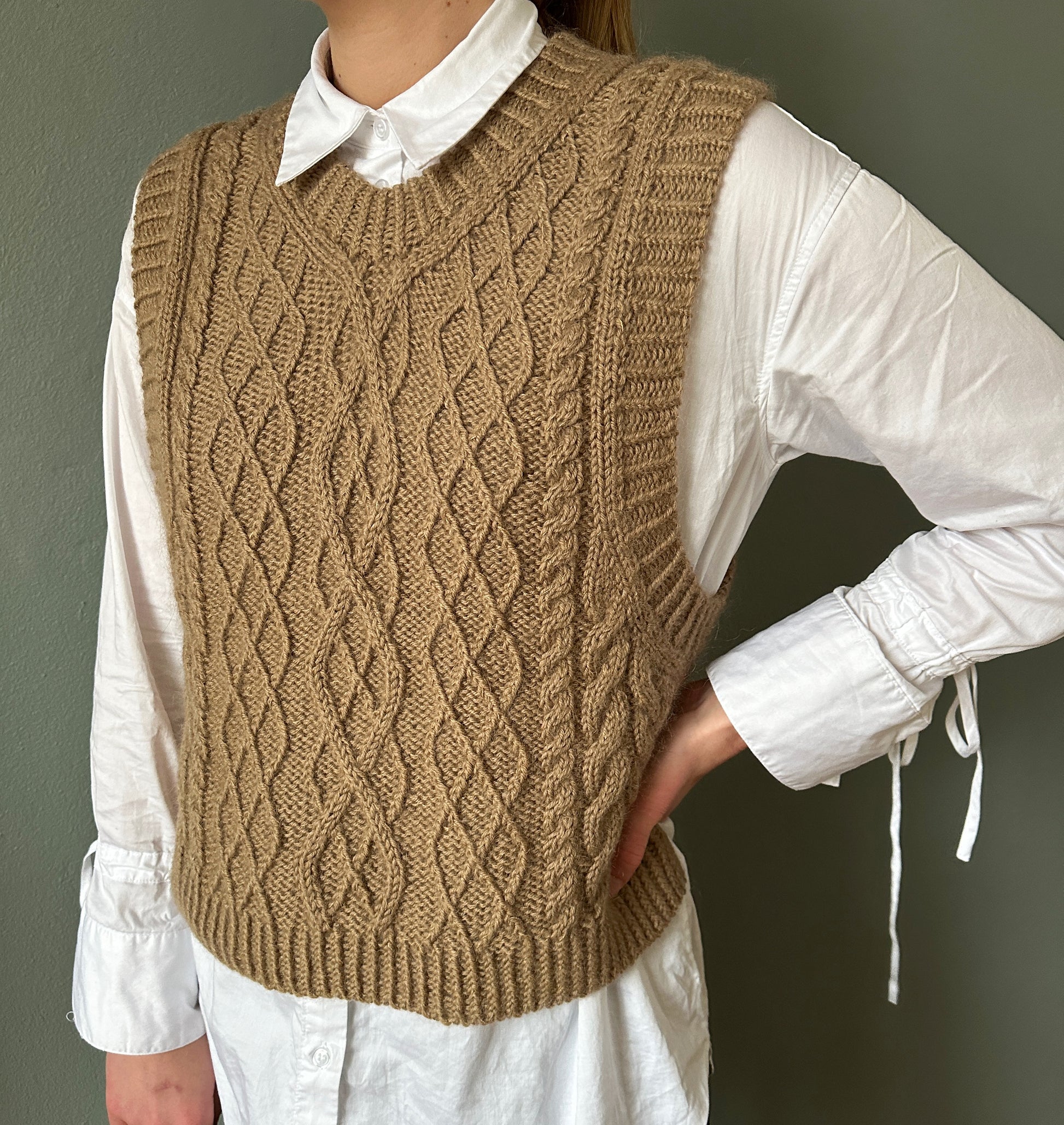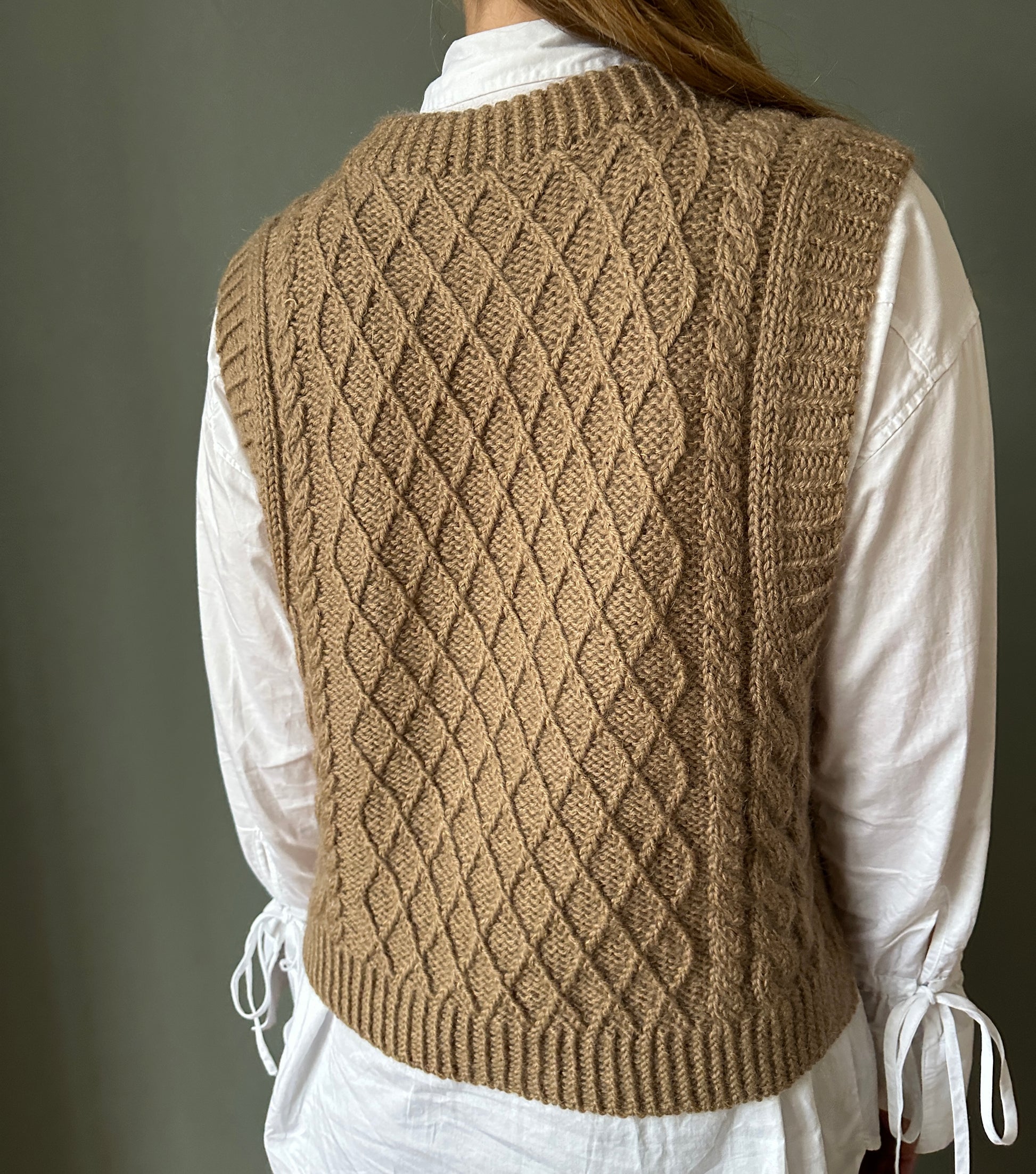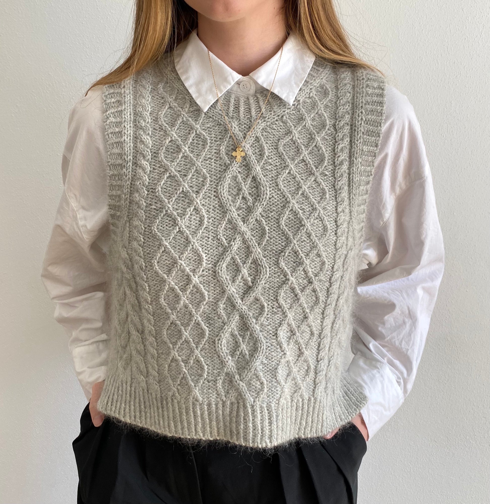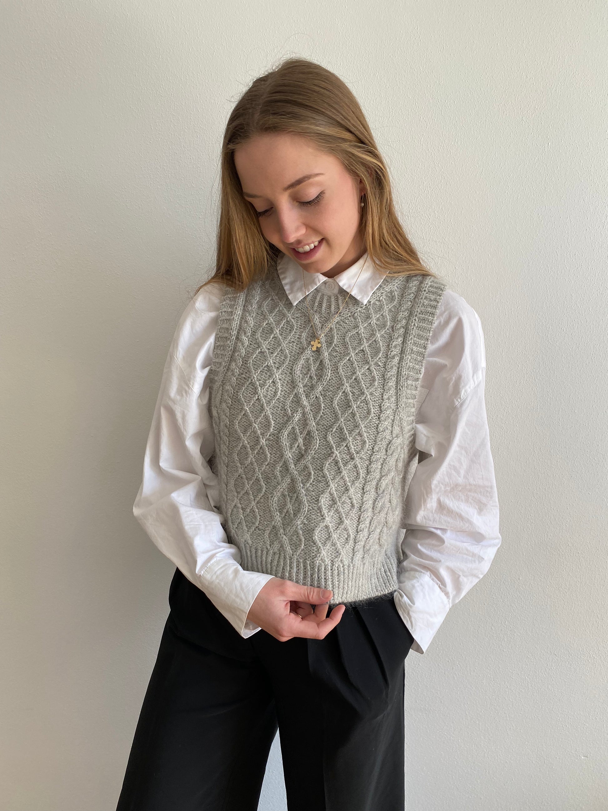 This pattern combines different structures, braids and cables in a slipover that is knitted from the top down. First the backpiece is worked, then stitches are picked up at the seam to form the shoulders. The front and back are joined and the body is worked in the round. Finally, all the rib edges are worked.