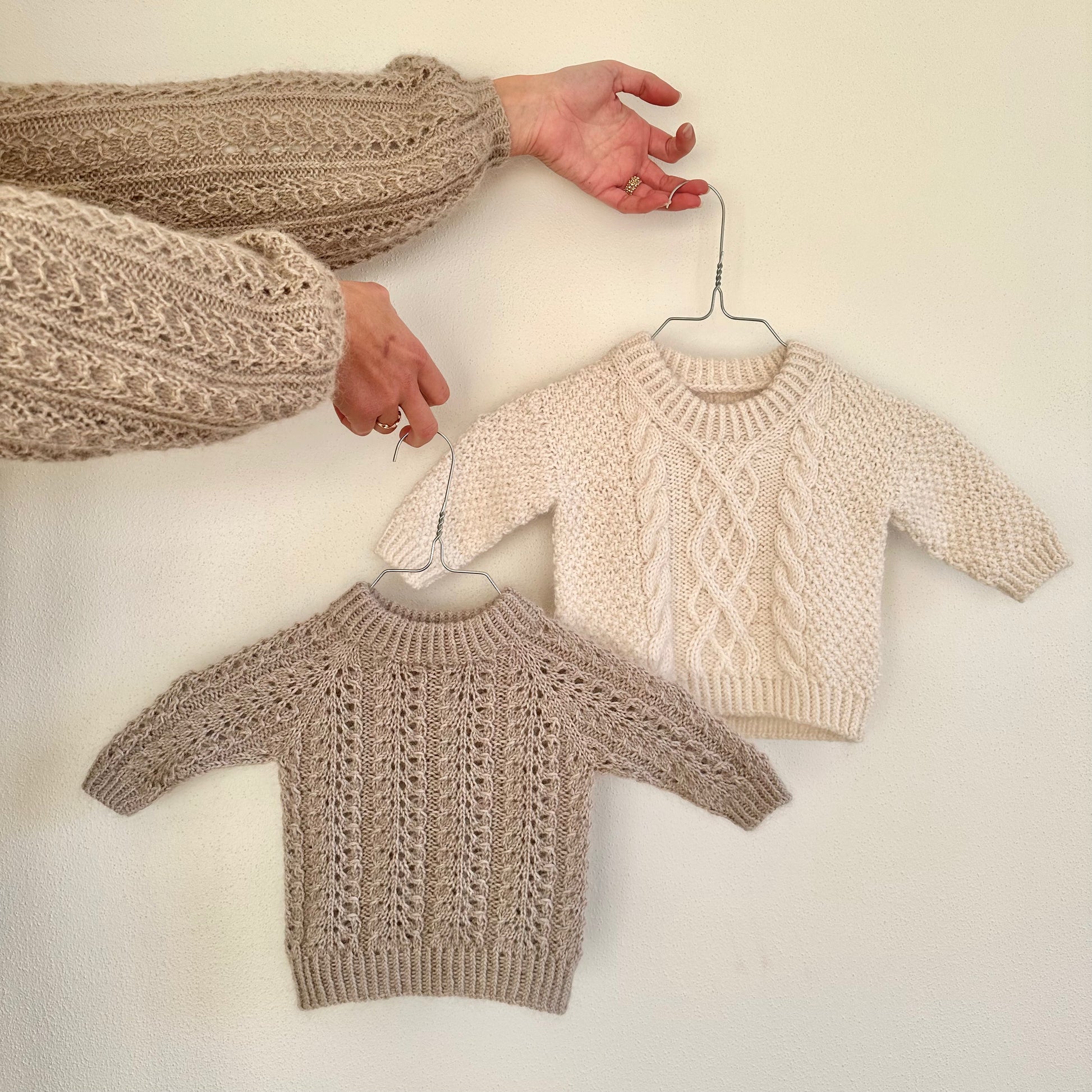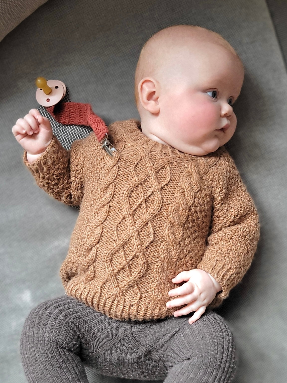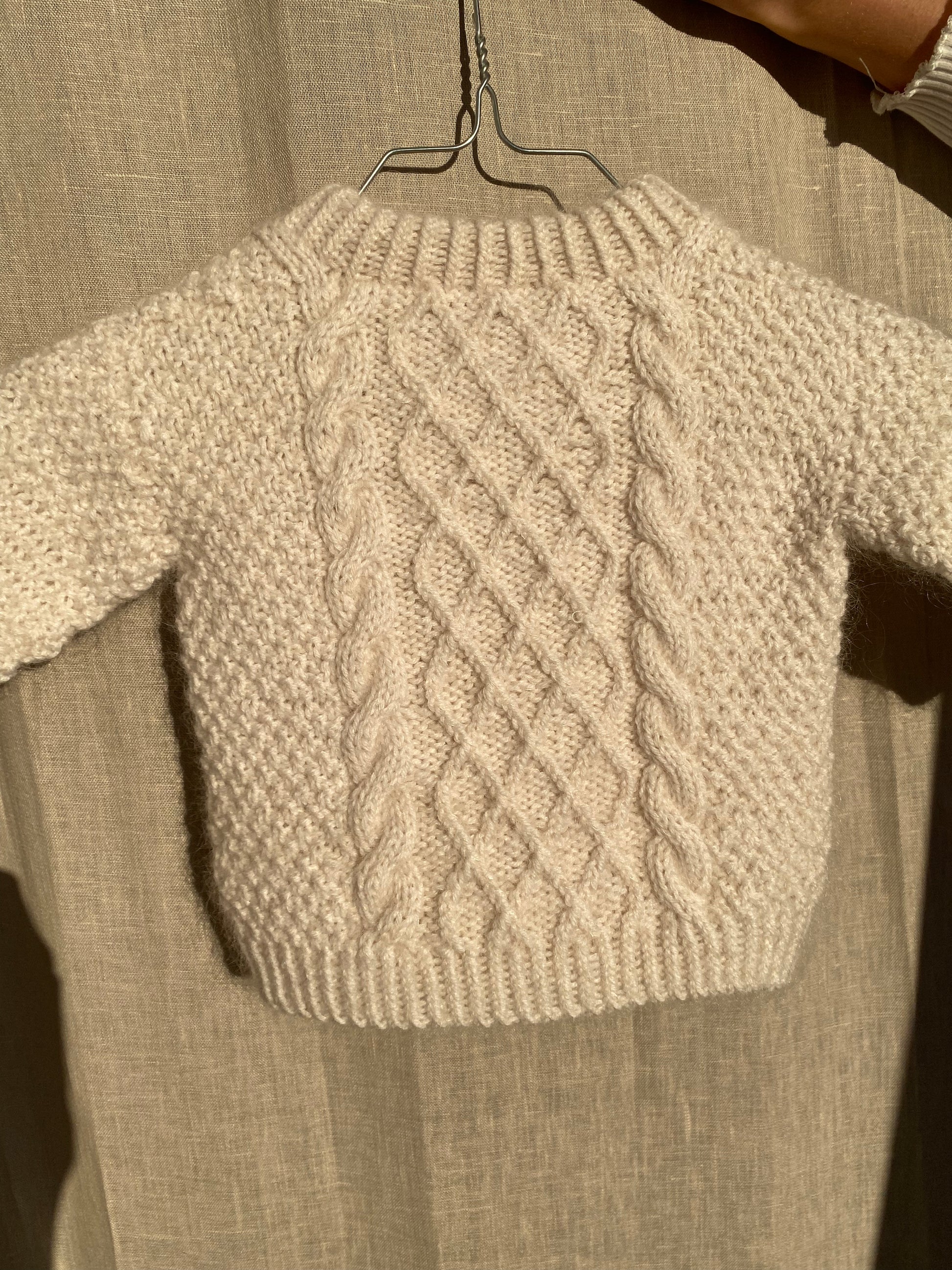 The sweater is worked top down. First the back is worked, then the shoulders which are shaped with short rows and increases to form the neckline. The shoulder pieces are joined to create the front of the sweater. When the correct length of the front- and back parts are reached, they are joined to form the body of the sweater, which is worked in the round.