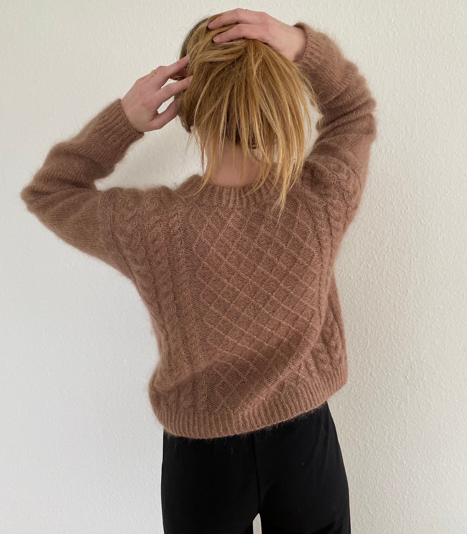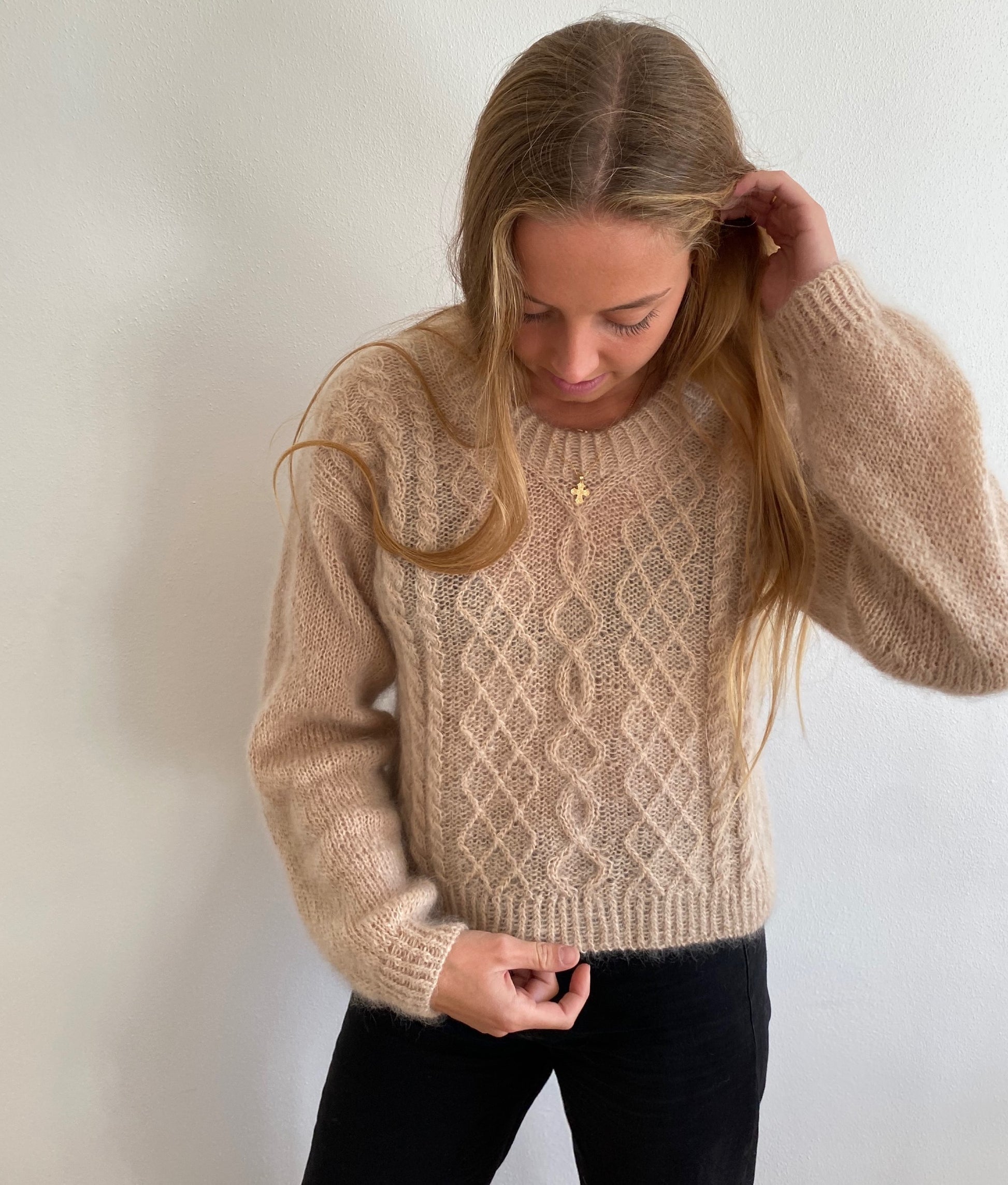 This pattern combines different structures, braids and cables in a sweater that is knitted top down. First the backpiece is worked, then stitches are picked up at the seam to form the shoulders. The front and back are joined and the body is worked in the round. Stitches are picked up to create the sleeves and short rows form the shoulders. Finally, the neck the worked in twisted rib.