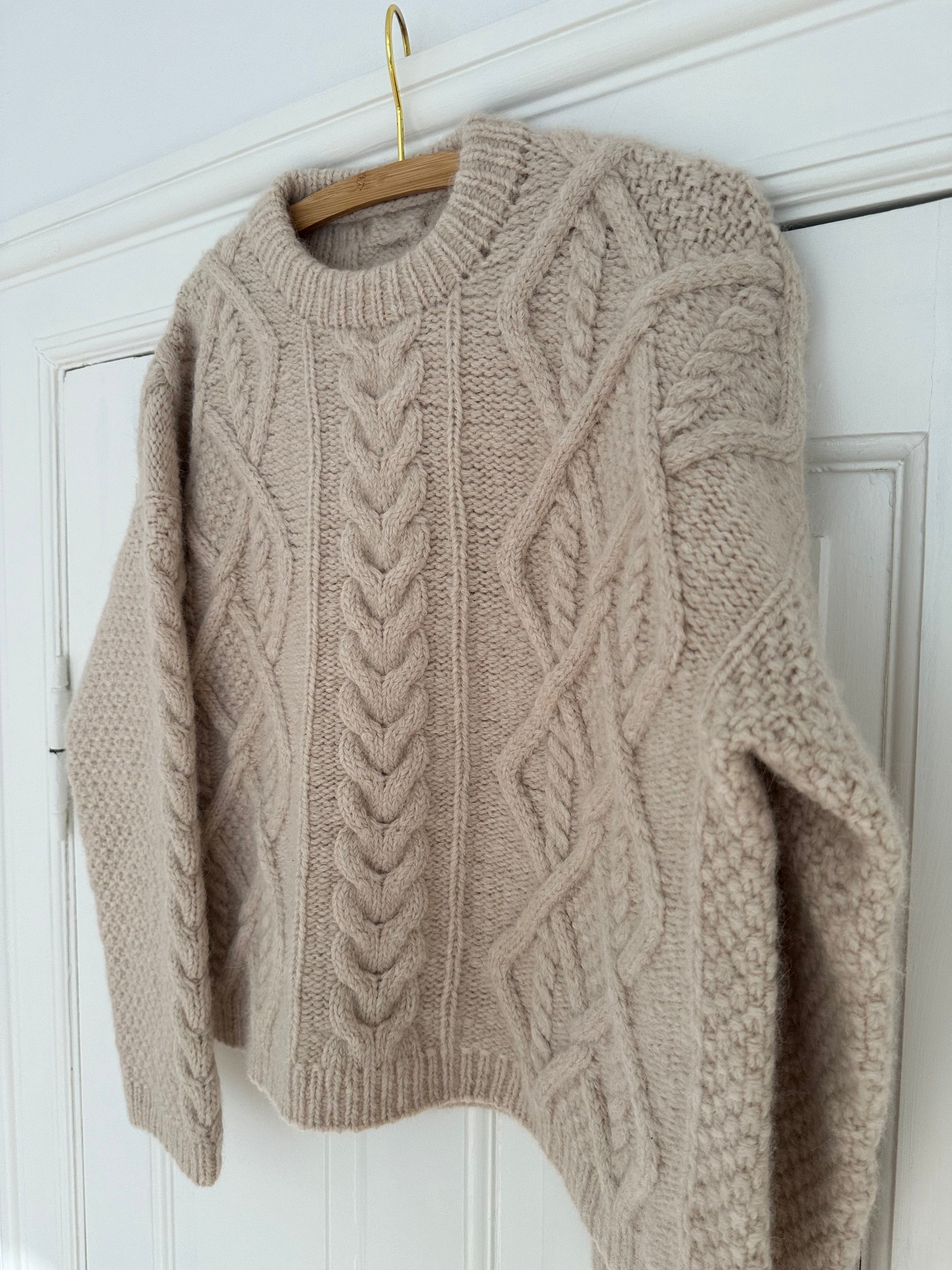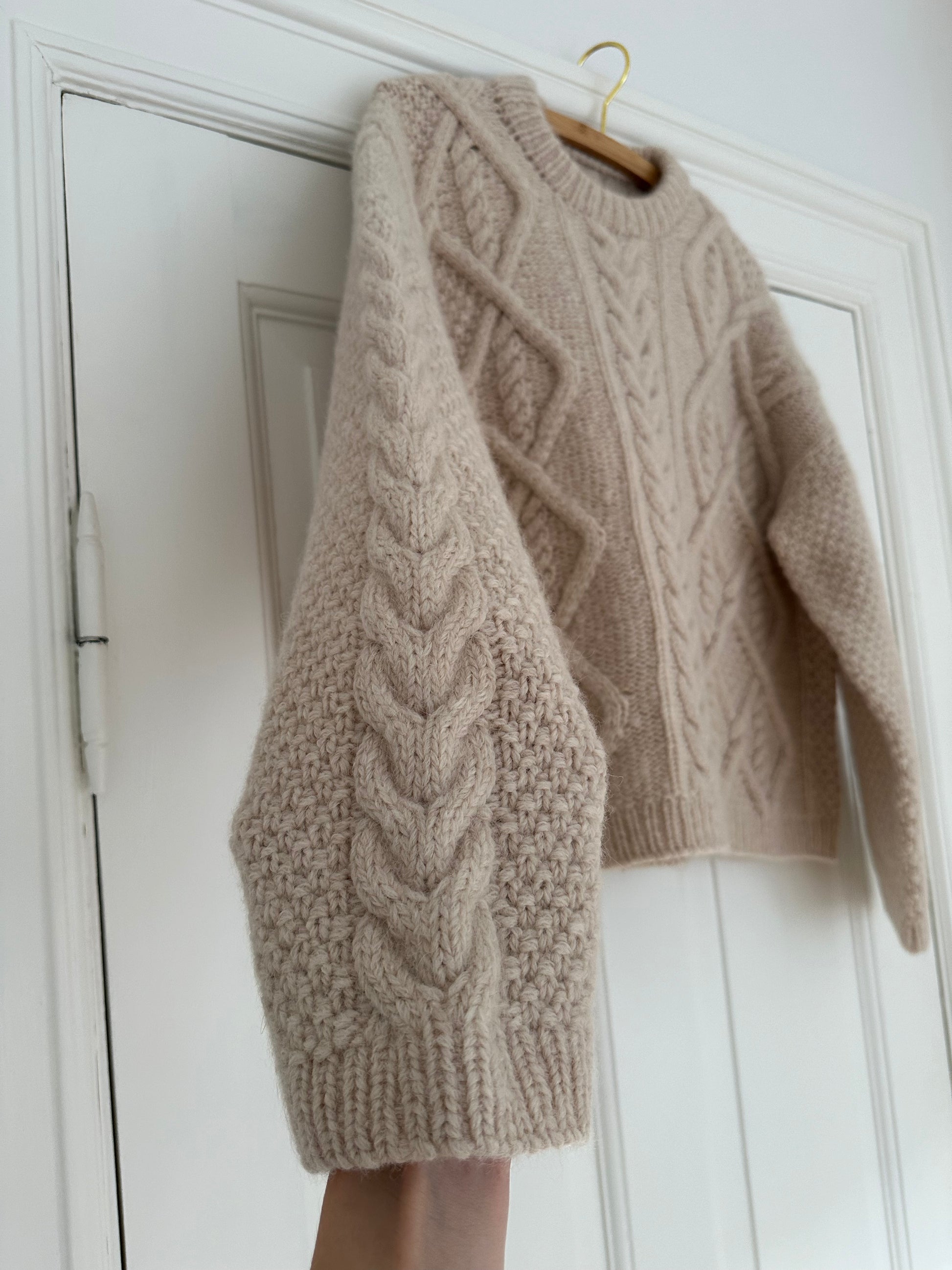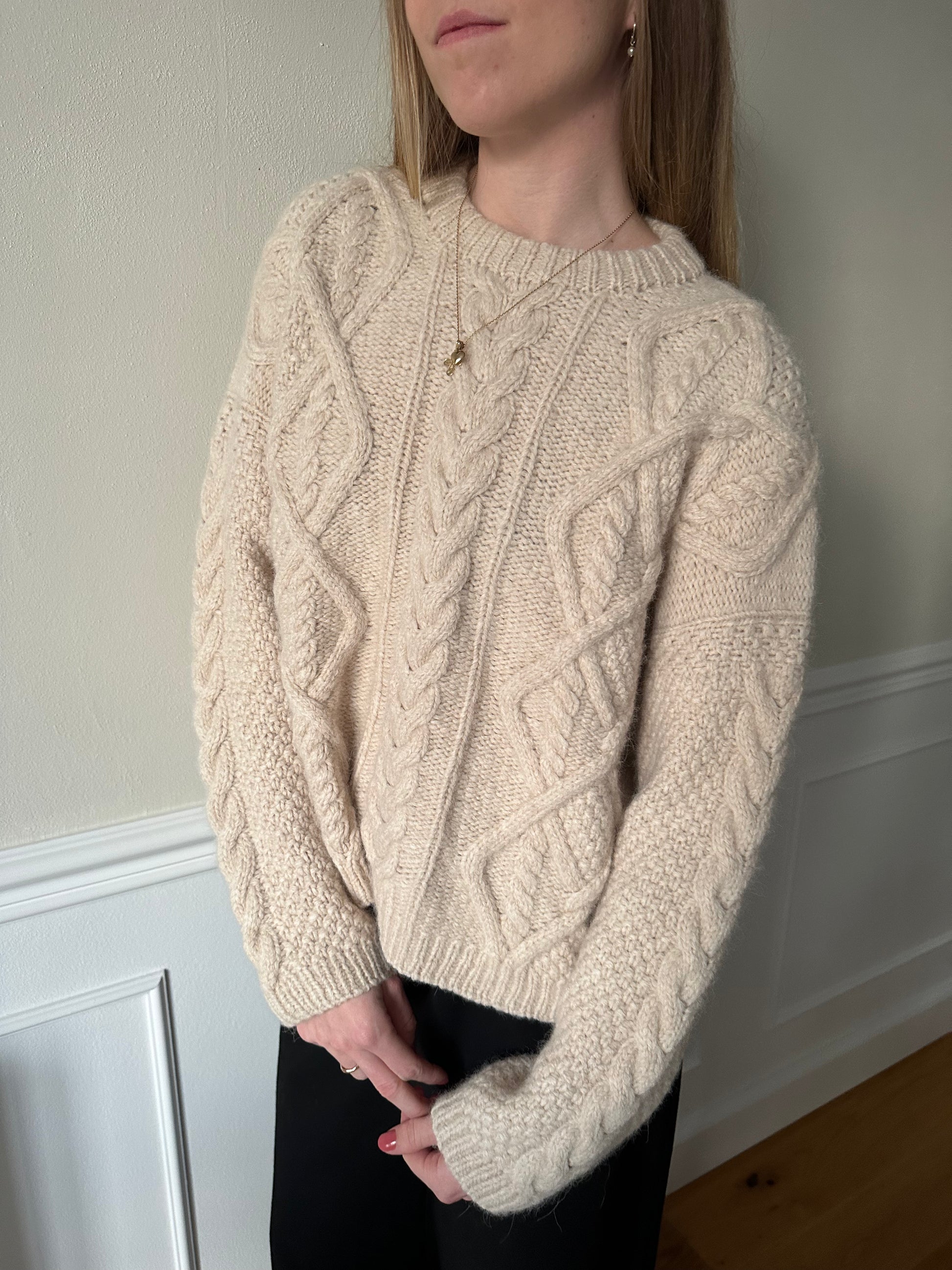 The sweater can be knitted in 3 different sizes, XS-S (M-XL) 2XL-3XL, corresponding to a circumference of the sweater of 120 (130) 140 cm. The sweater is designed to have a positive easy of 20-40 cm.