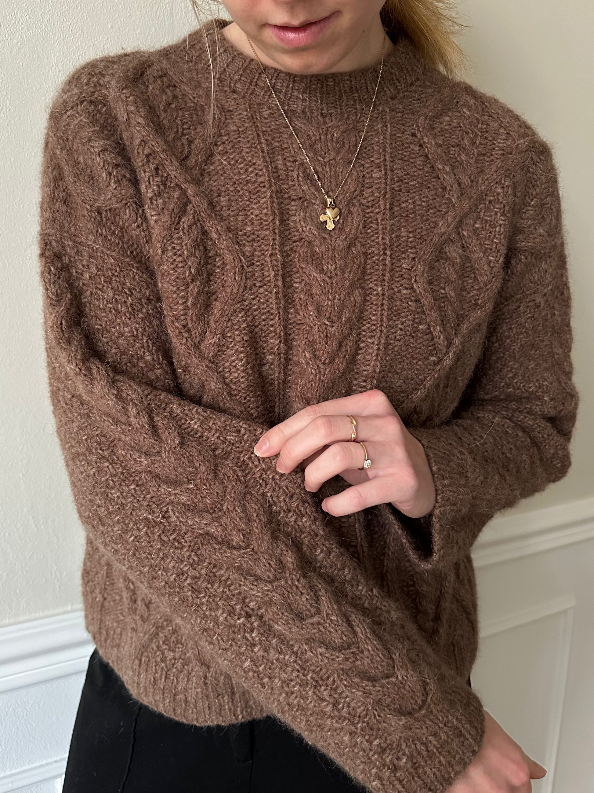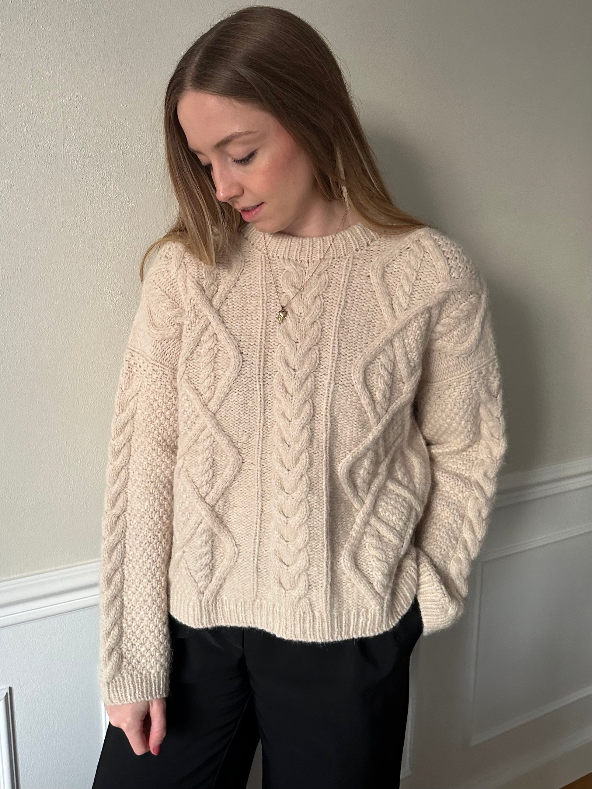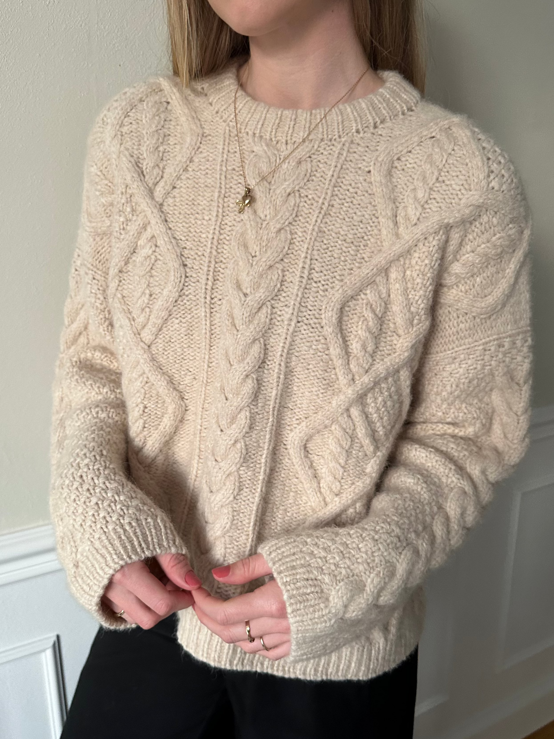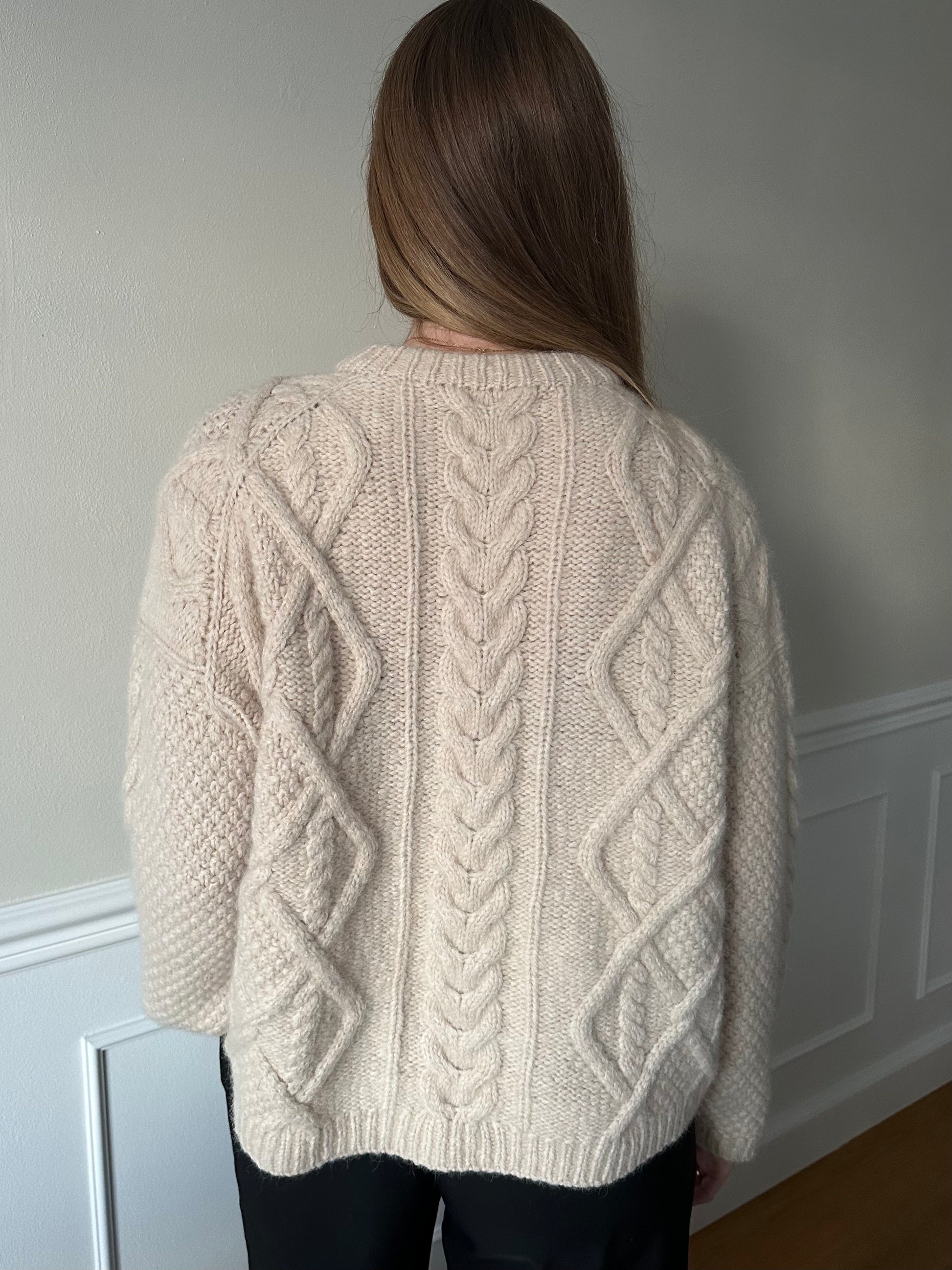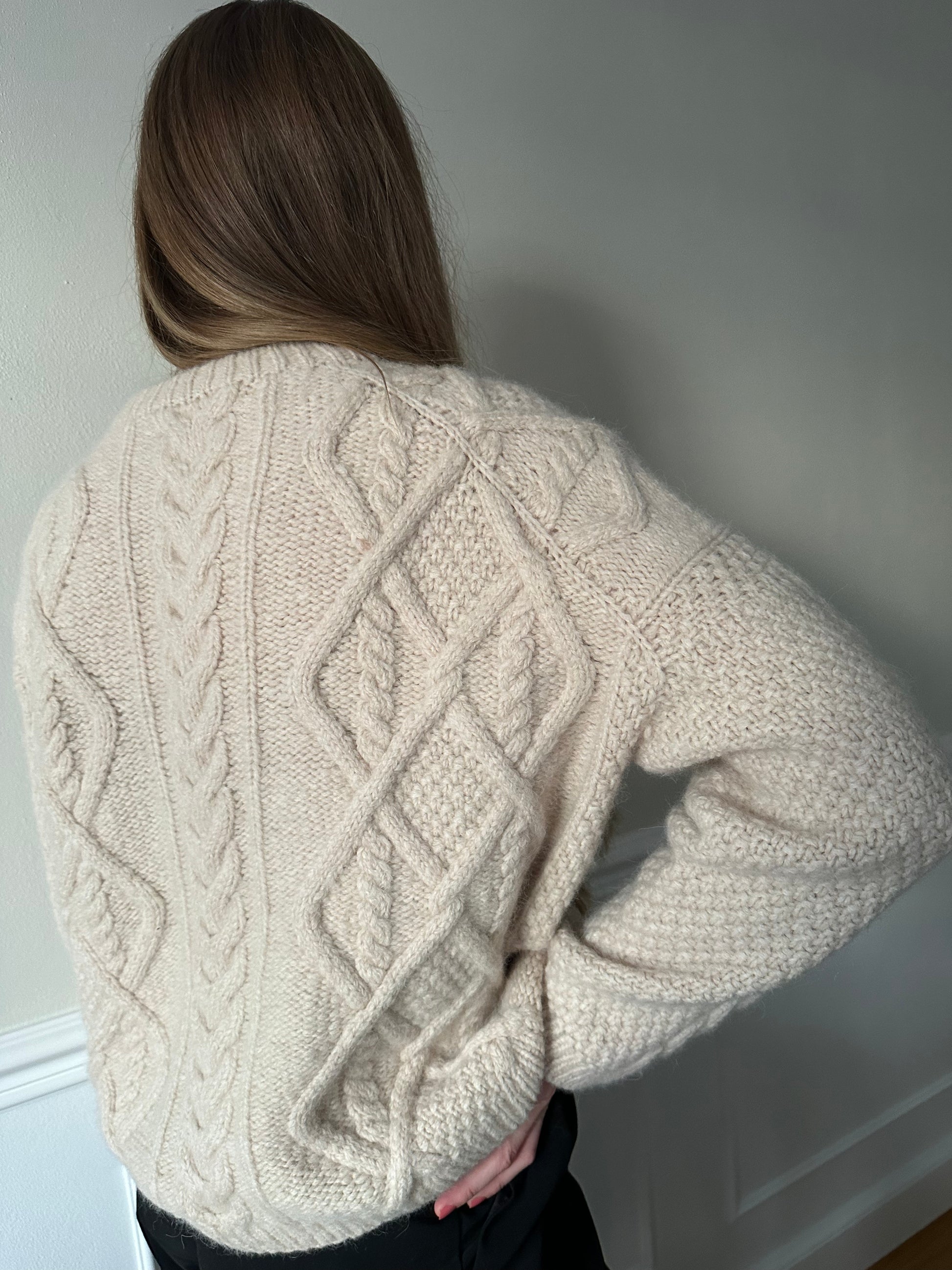 The sweater is knitted from the top down. Stitches are cast on for the back piece, which is worked flat while doing increases. Stitches are then picked up along the upper edge of the back piece, for the left and then right shoulder piece. The two shoulder pieces are worked flat and with increases to create the neckline. The two pieces are joined to create the front piece, which is also worked flat. The front and back pieces are eventually joined, creating the body which is worked in the round and finished with a rib edge and Italian cast-off. Stitches are picked up along the neckline and worked in rib, folded double and knitted into place. Finally, the sleeves are made by picking up stitches along the armholes and working them in the round while doing increases on the underside. They are finished with a rib and Italian cast-off.